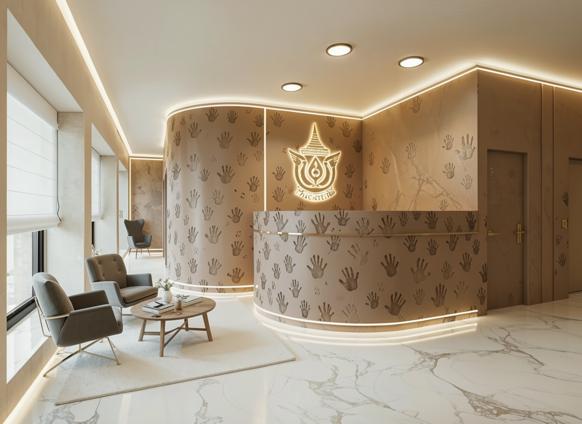 print real light brown negative rodin secret motive to light brown clay all over reception desk and all brown walls light up more brass door handles on doors glossy marble floor