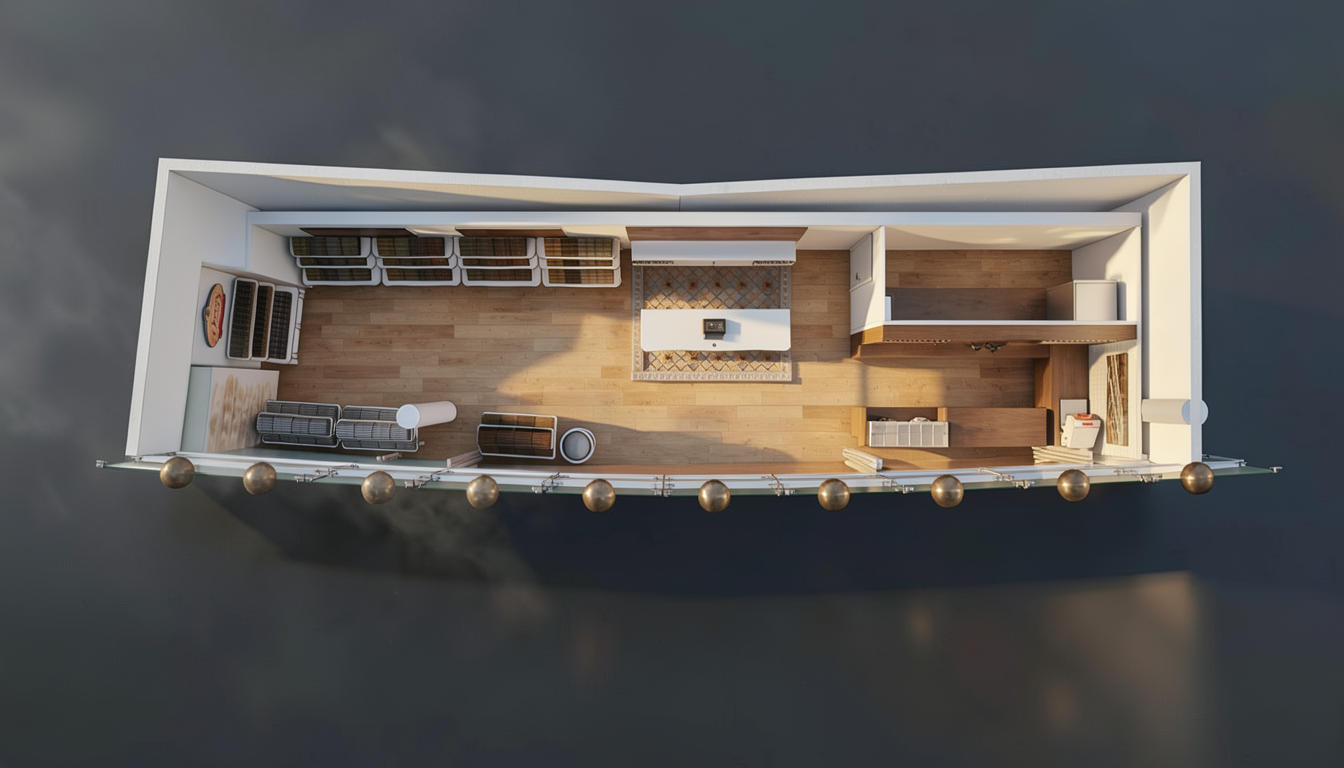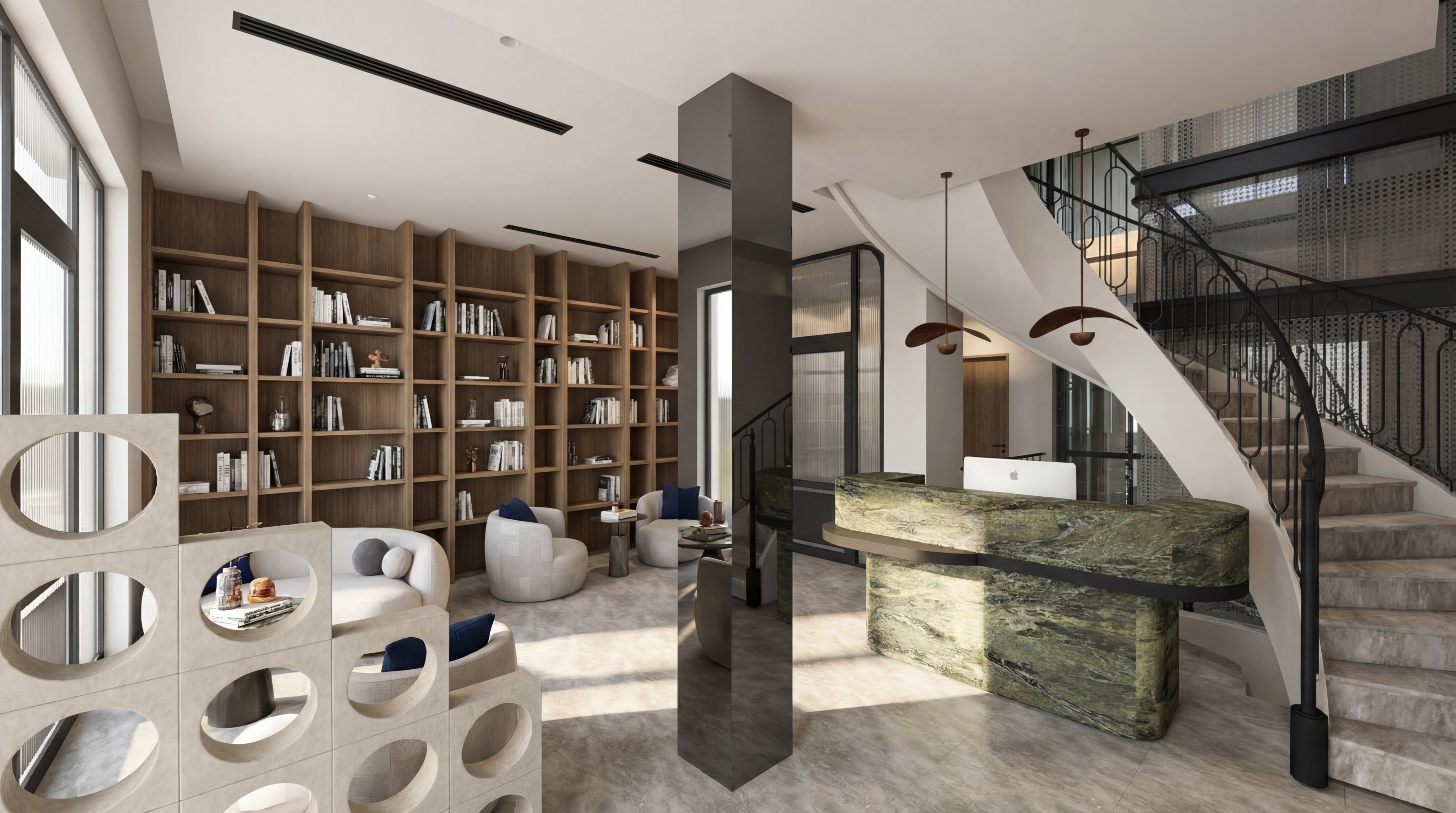 disappear black lines from the ceiling switch on the ligths add vertical led lights in the shelves give general midday daylight atmosphere it is a lobby of a boutique hotel