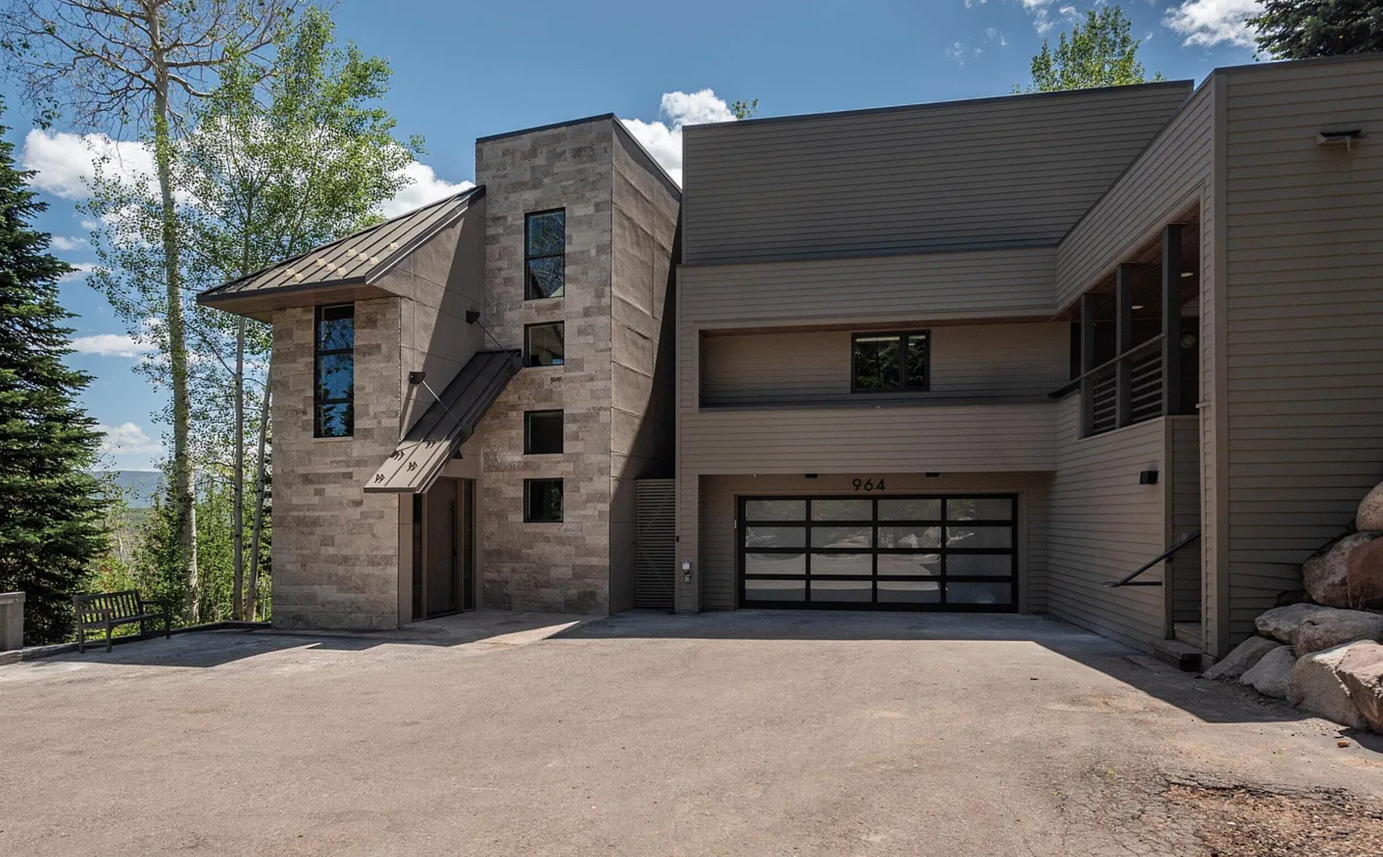 modernist exterior shot render a modern house with a sleek and elegant design the walls are constructed from natural stone in shades of light gray and beige complementing the contemporary architecture the roof and window frames are a dark charcoal gray creating a sophisticated contrast depict large floor to ceiling windows that reflect the serene natural environment the sky is a clear vibrant blue with fluffy white clouds enhancing the peaceful atmosphere surround the house with lush green trees and subtle foliage implying a harmonious blend with nature the driveway is smooth and clean in a soft gray tone inviting and spacious architecture