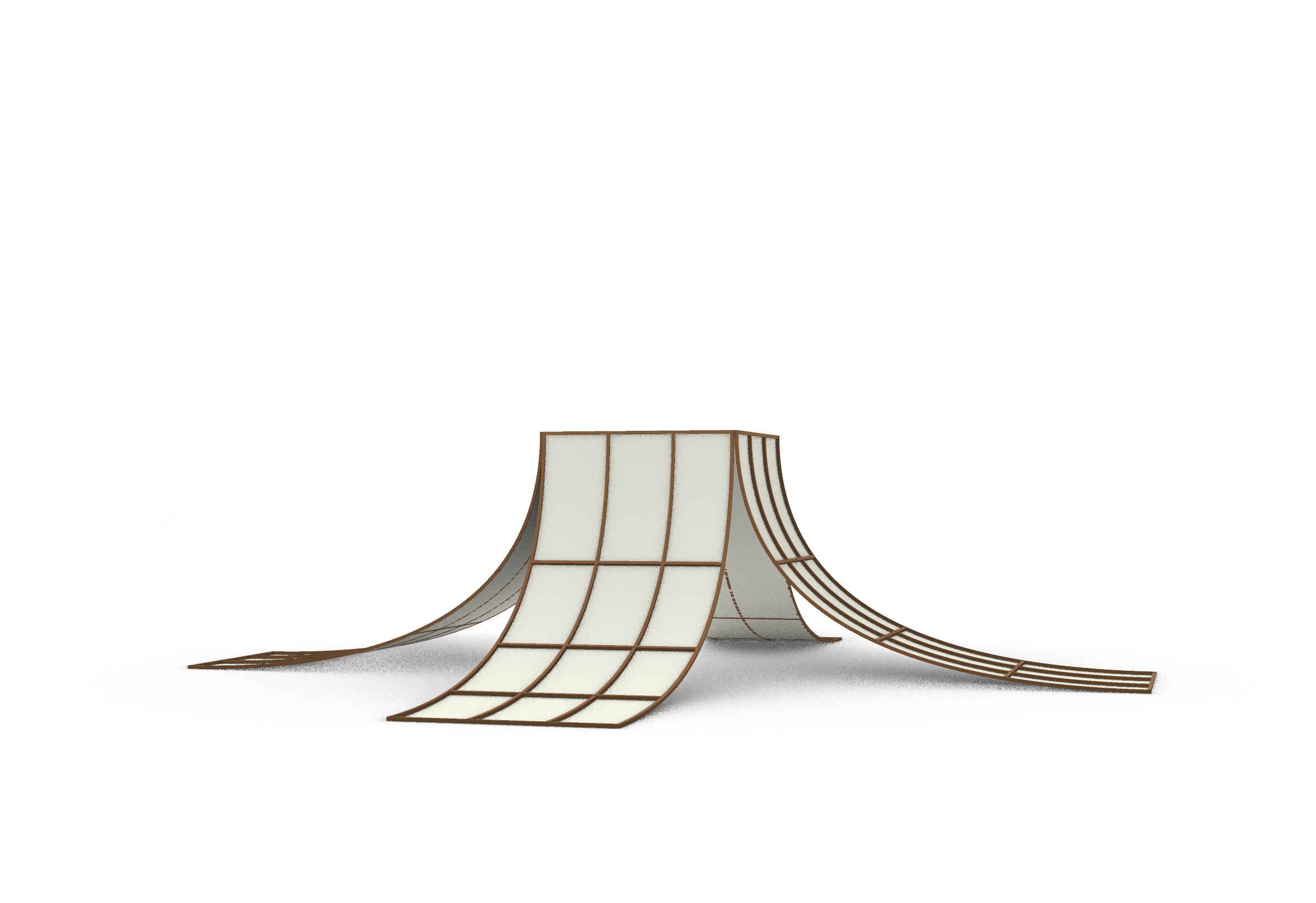 pavilion made of timber and linen fabric place in a tranquil and minimalist park add people standing underneath