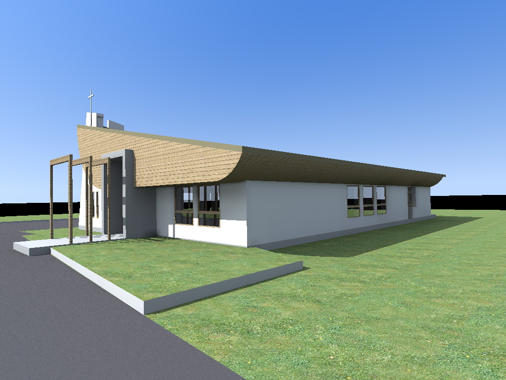 convert the image into a realistic outdoor photograph with professional architectural aesthetic maintaining 100 of the geometry and layout applying authentic materials afternoon warm lighting with soft shadows and a sharp photorealistic result add landscape design behind the building do not change material colors