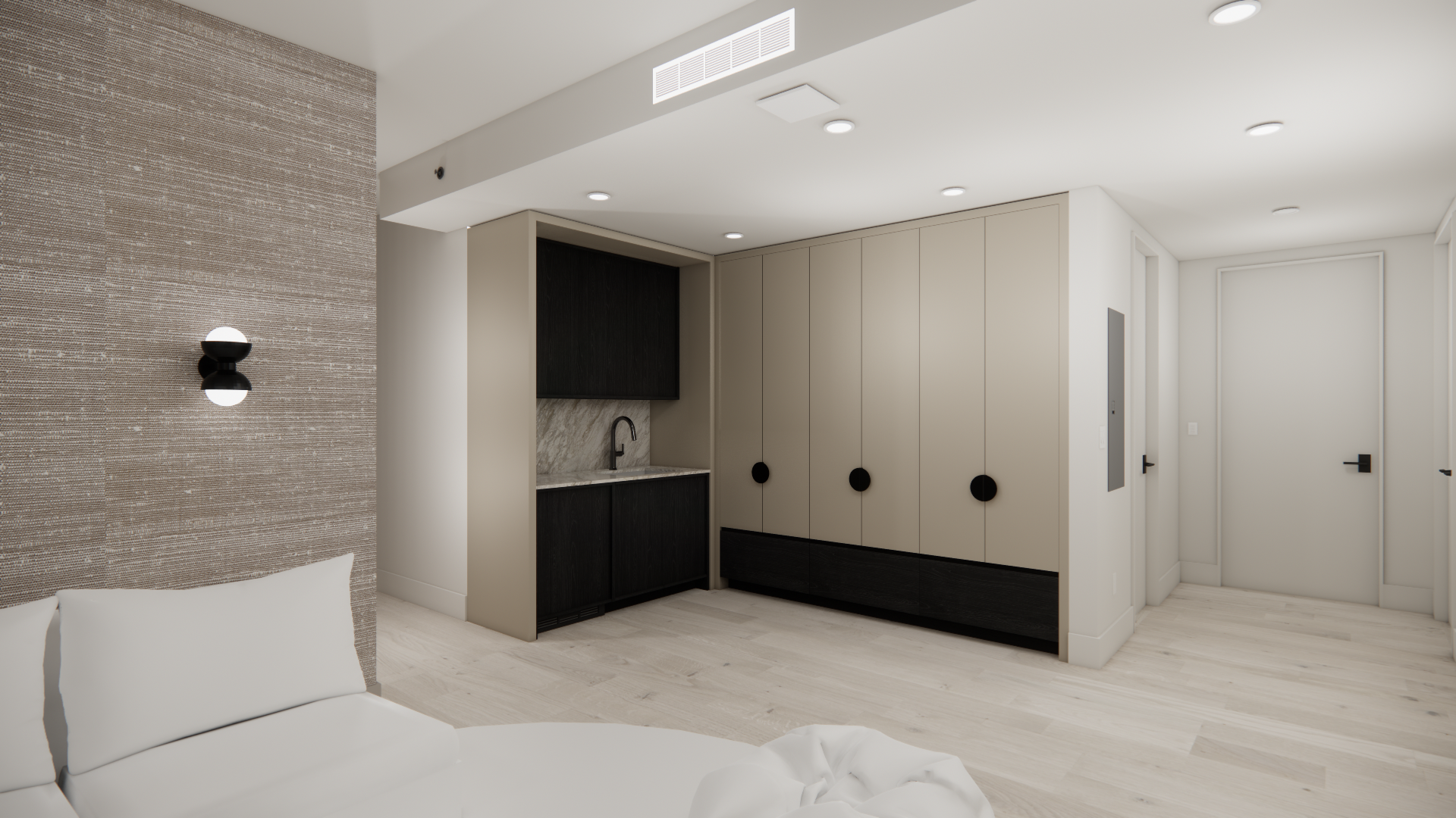 enhance this render to look more realistic improve lighting shadows reflections and material realism but do not add remove or alter any elements objects or materials keep everything exactly the same just make it more photorealistic keep this looking light ans bright keep the wood the same color we show it keep the cabinets matte