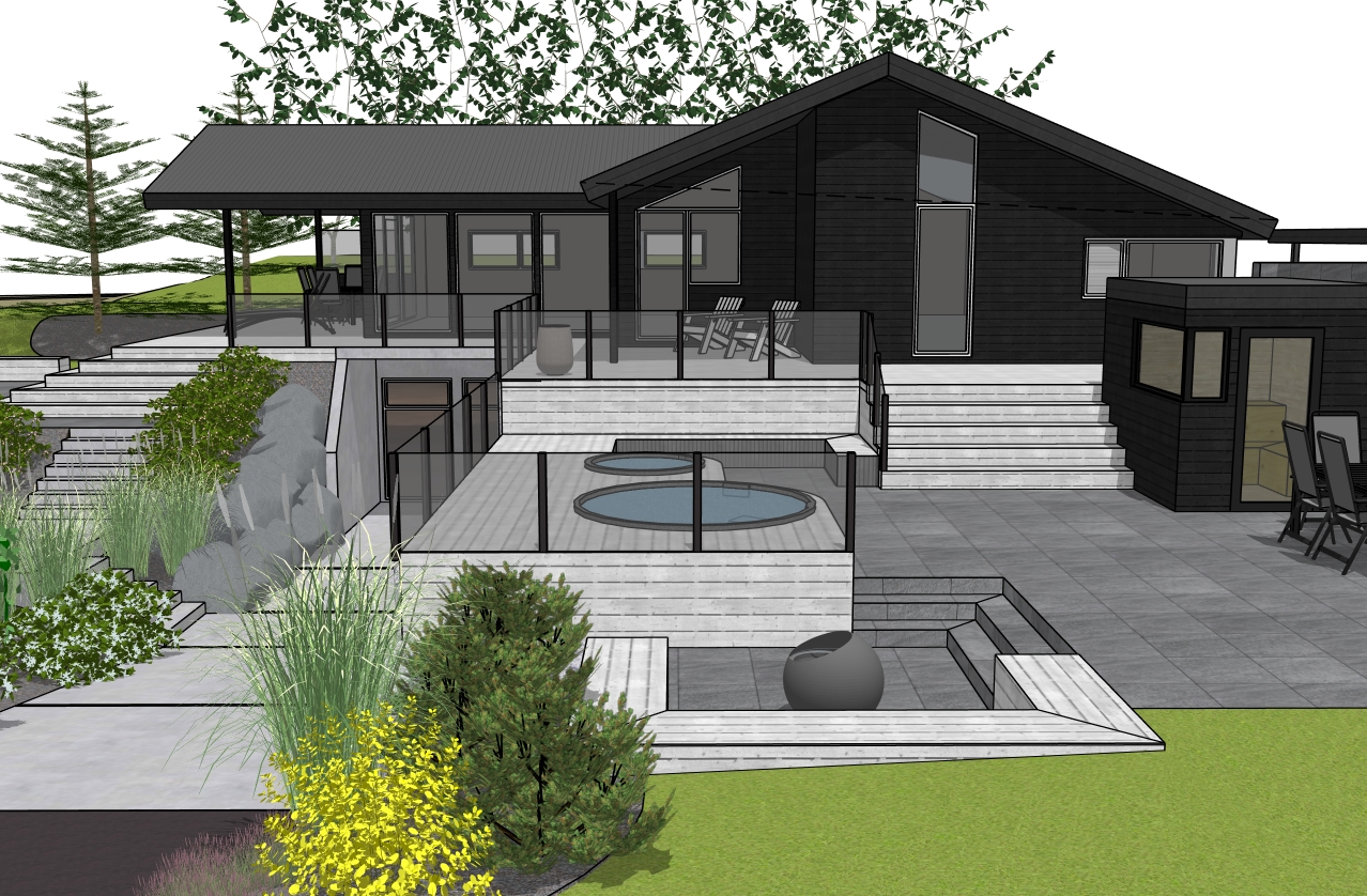 photorealistic scandinavian modern summer house garden black timber house with large windows multi level wooden terraces and dark stone paving outdoor spa pools with glass railings naturalistic nordic planting with grasses and shrubs granite boulders minimalist outdoor furniture soft evening sunlight cinematic lighting highly realistic materials architectural visualization icelandic landscape atmosphere ultra detailed natural colors