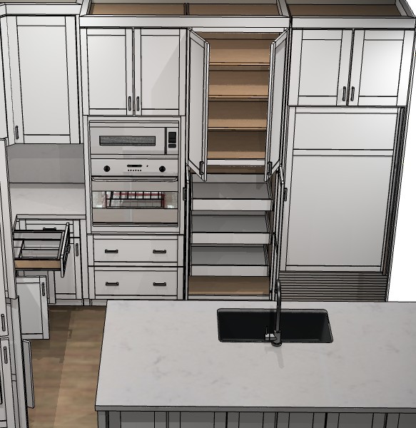 photorealistic architectural render of this kitchen from the exact same oblique camera angle and framing as the reference image preserve all geometry without exception stacked oven tower microwave unit open pantry cabinet with double doors and pull out trays adjacent cabinetry left side open lower storage island in the foreground black sink black faucet wood flooring and all wall boundaries do not add remove or invent anything materials white shaker cabinetry with satin painted finish warm oak interiors on open pantry shelves and cabinet interiors white quartz island countertop with subtle gray veining black undermount sink black faucet brushed stainless steel appliance finishes medium warm wood flooring lighting strong directional natural daylight entering from the upper left creating dramatic but controlled contrast across the cabinet faces oven tower open pantry interior and island surface deep realistic shadows inside the open cabinets and pull out trays soft ambient bounce to fill secondary surfaces humanization nuanced paint finish on cabinet doors realistic wood grain inside the pantry believable appliance reflections subtle quartz highlight authentic shadow at reveals and hinges natural spatial depth no accessories no food no decor no people negative do not change camera angle do not alter geometry do not add or remove elements do not modify open or closed positions of any door or drawer fridge is panel ready as shown in the image reference