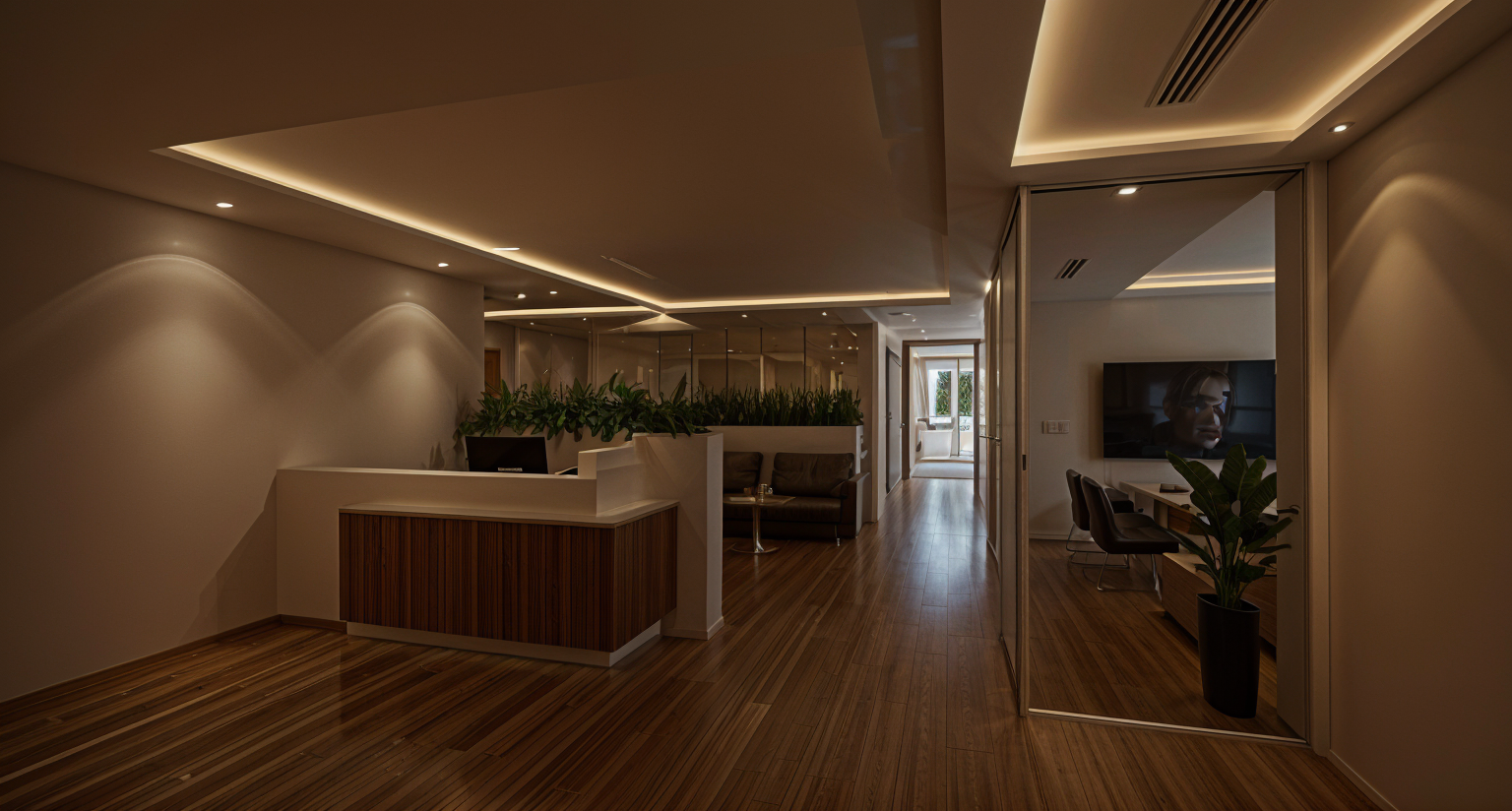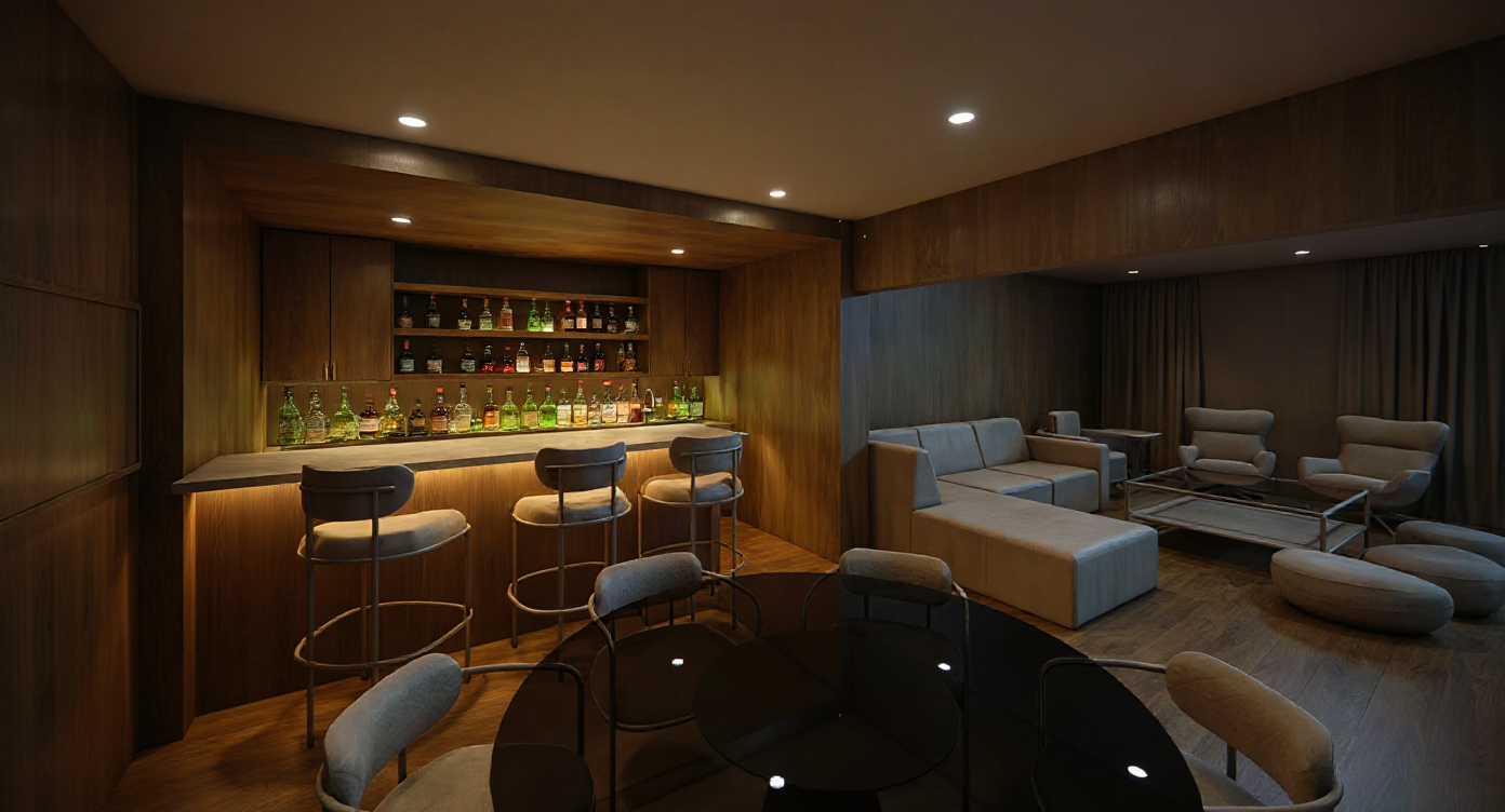 photorealistic image bright bar and lounge space add bar glass and liquor to counter and shelves dark leather couch with cloth upholstered chairs and poufs