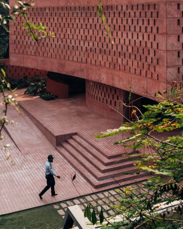exterior shot make the building with realistic concrete and bricks all the green in the image is a park around the building