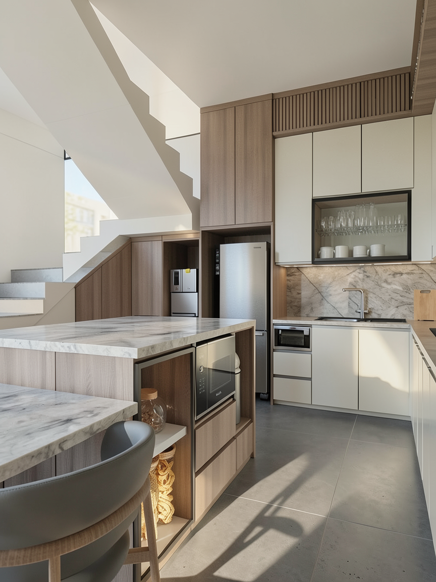 create an ultra realistic image without changing any of the structure shape design or materials don t resize the jpeg add indirect lights around the mirror plain white ceiling with no indirect lights white granite 60x 60cm walls cream wood colored cabinets and glass frames