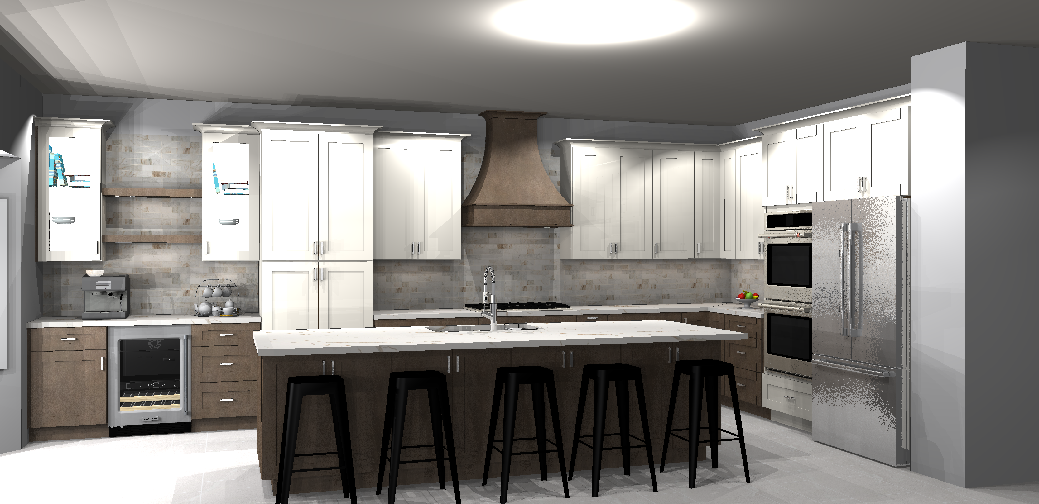 make it realistik keep finishes white and mocha keep layout coffee section has glass wall cabinets do not change it