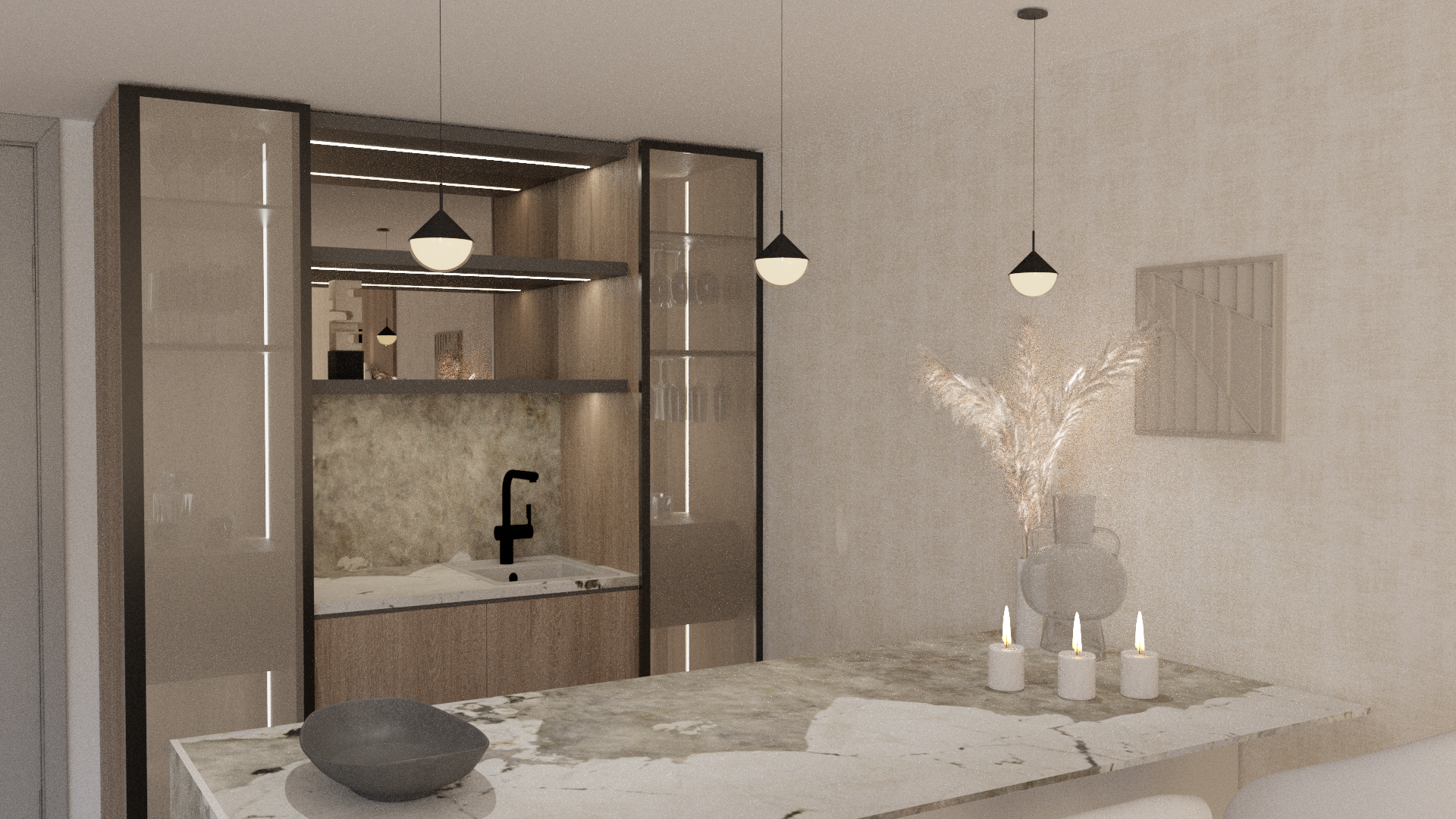 neceisto mejorar esta imagen fotorealista profesional elimina ruidos y mejora las texturas sin cambiar nada regula el tono de la imagen se ve demasado amarilla en las vitrinas el vidrio debe ser mas transparente
