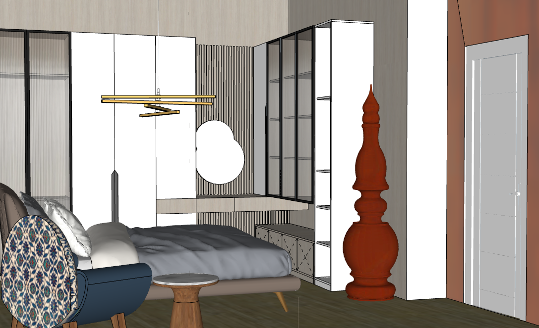 contemporary interior shot lush light bedroom wooden floor wardrobe white door to the right architecture