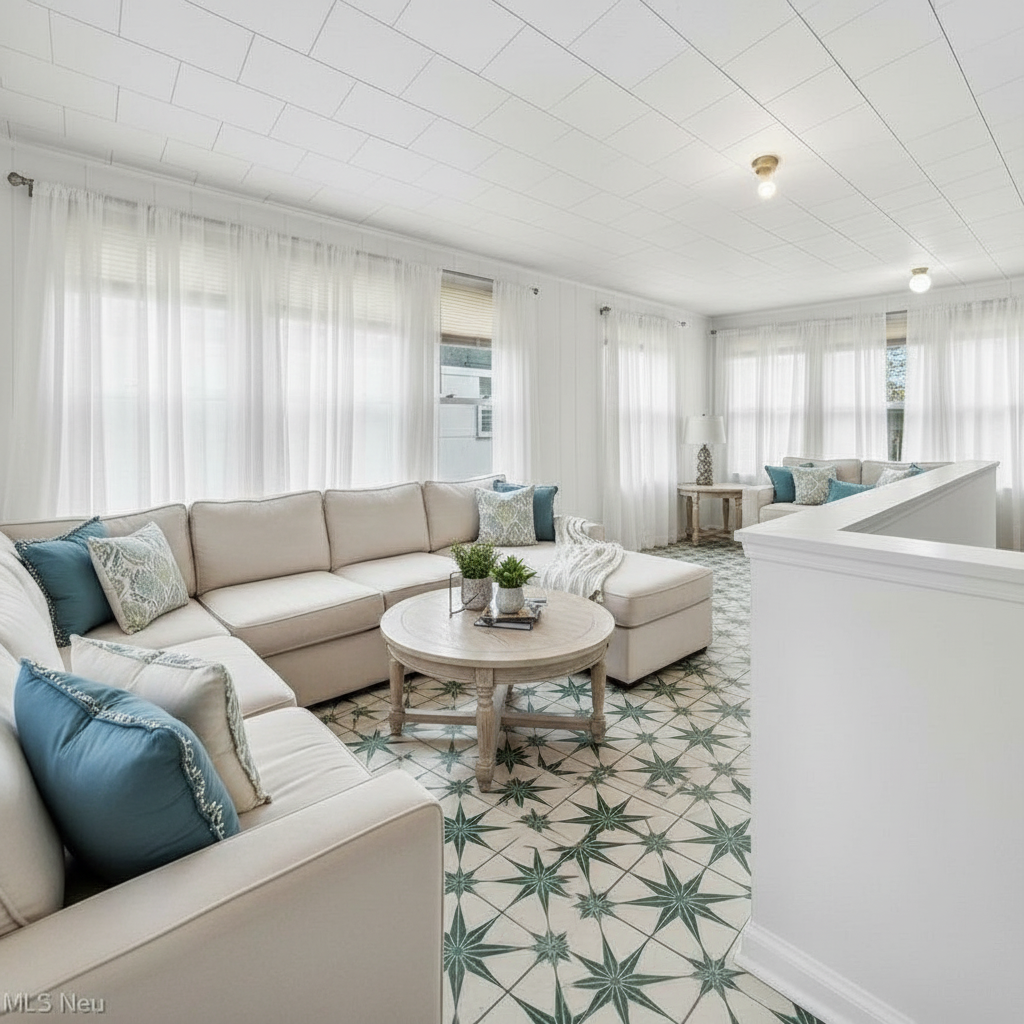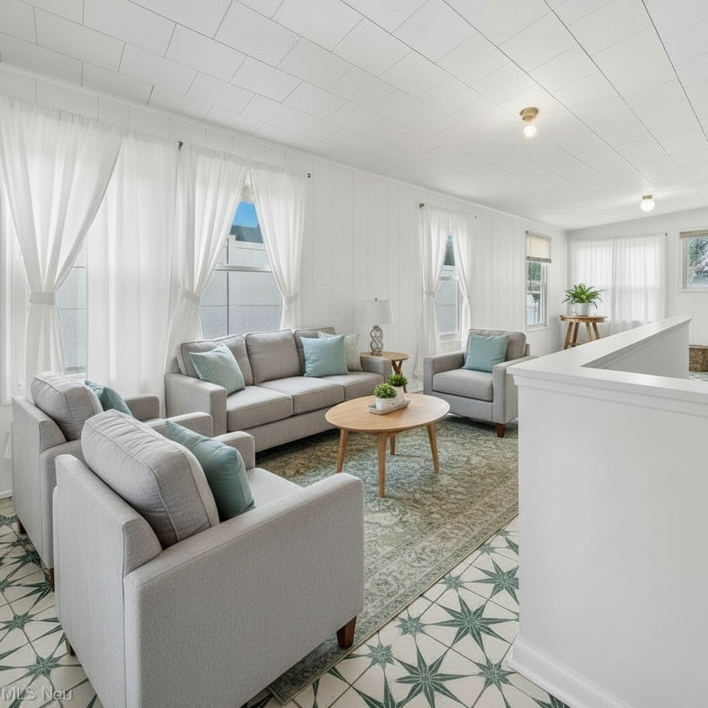 make this sunroom inviting by adding lounge chairs a small table in the back corner and white drapery