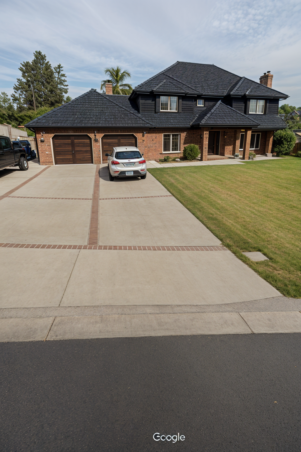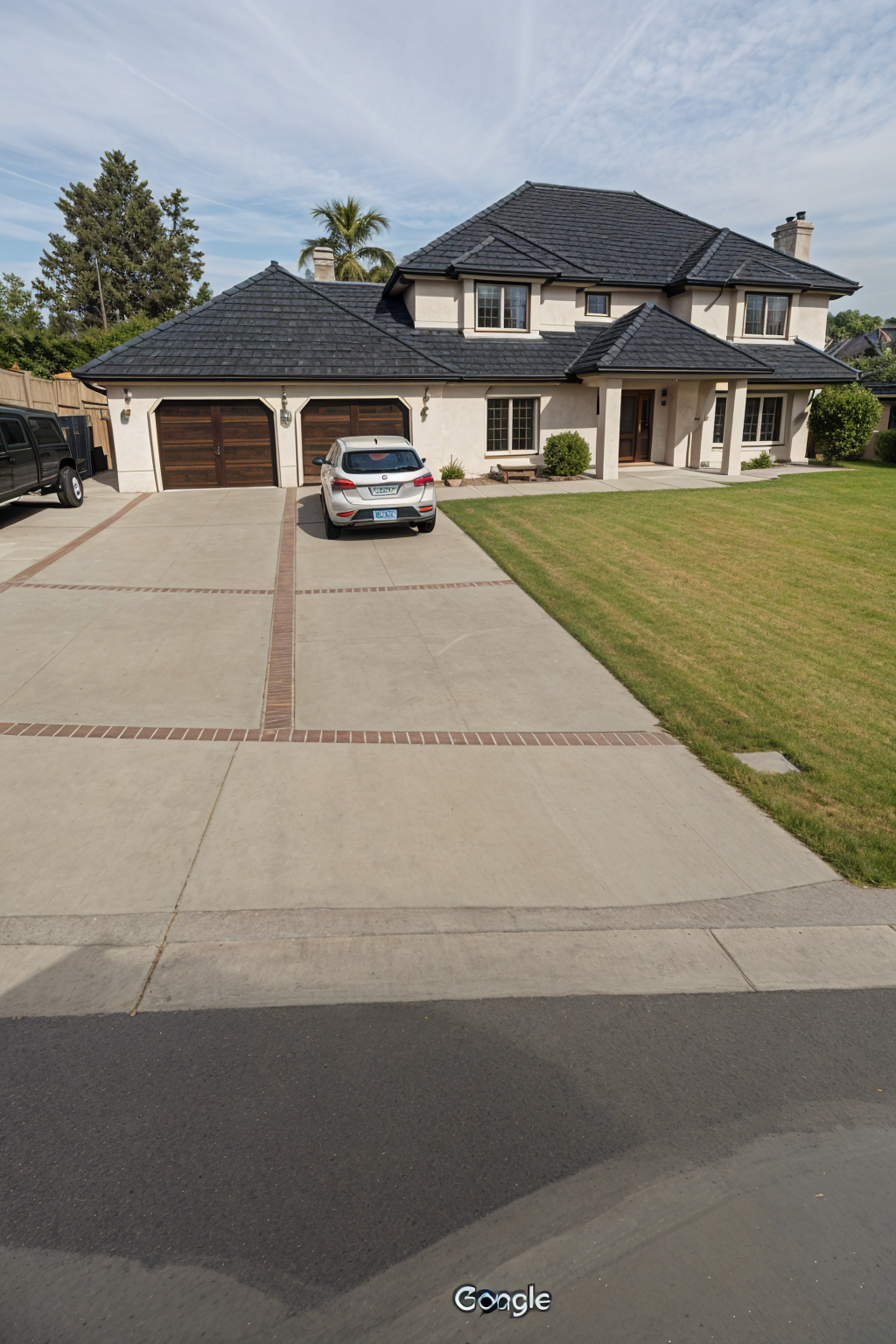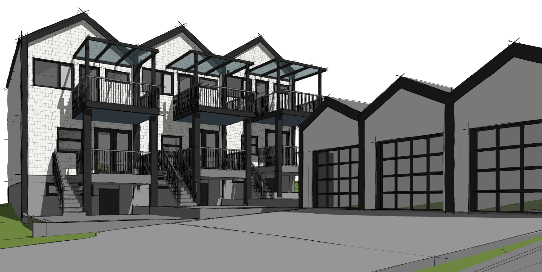 generate a realistic 3d rendering of a modern row of three houses each house has a gable roof and large windows use a sleek minimalist color palette off white and charcoal gray facade black window frames and dark gray roofs front doors in deep charcoal concrete steps and pathways soft gray transitioning to vibrant green grass bright daylight scene with clear blue sky casting gentle shadows and creating a welcoming contemporary atmosphere lush seattle sunny cloudy day modern prairie style landscaping large pampas grasses and cedar shrubs