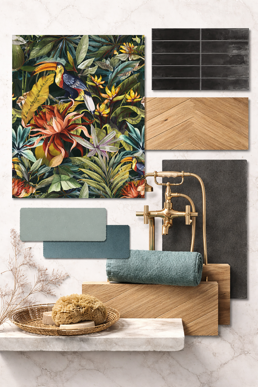 exterior shot perspektive und position der installationen so lassen links dusche mit eleganter glaswand abgetrennt in der mitte ein aufsatzwaschbecken auf einem h ngenden unterschrank rechts die wandmontierte toilette high end fotorealismus luxus bad