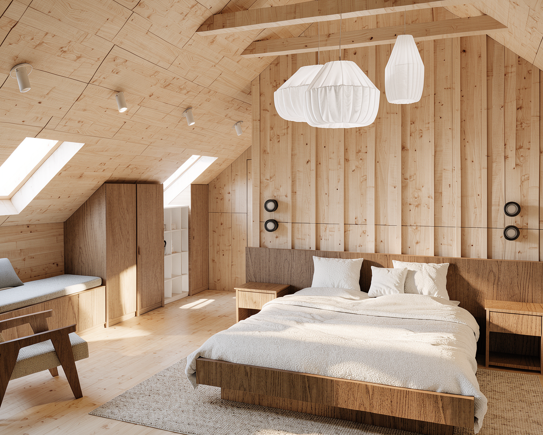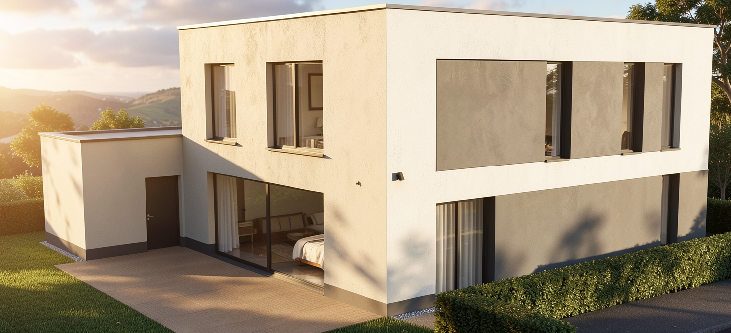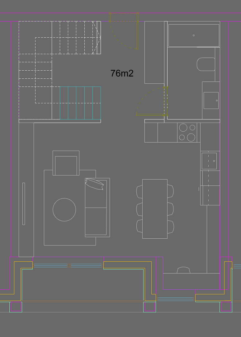 realistic architectural floor plan 76 sqm apartment single floor layout top left double flight staircase with landing top right bathroom with bathtub toilet and sink right side l shaped kitchen with 4 burner cooktop sink countertop and refrigerator center and left open plan living and dining area with corner sofa round coffee table rectangular dining table for 6 full width balcony loggia along the south wall with two sliding glass doors interior doors with swing arcs shown clean white background black walls architectural top down orthographic view professional real estate floor plan style 1 50 scale metric units furniture shown in plan view room labels in polish