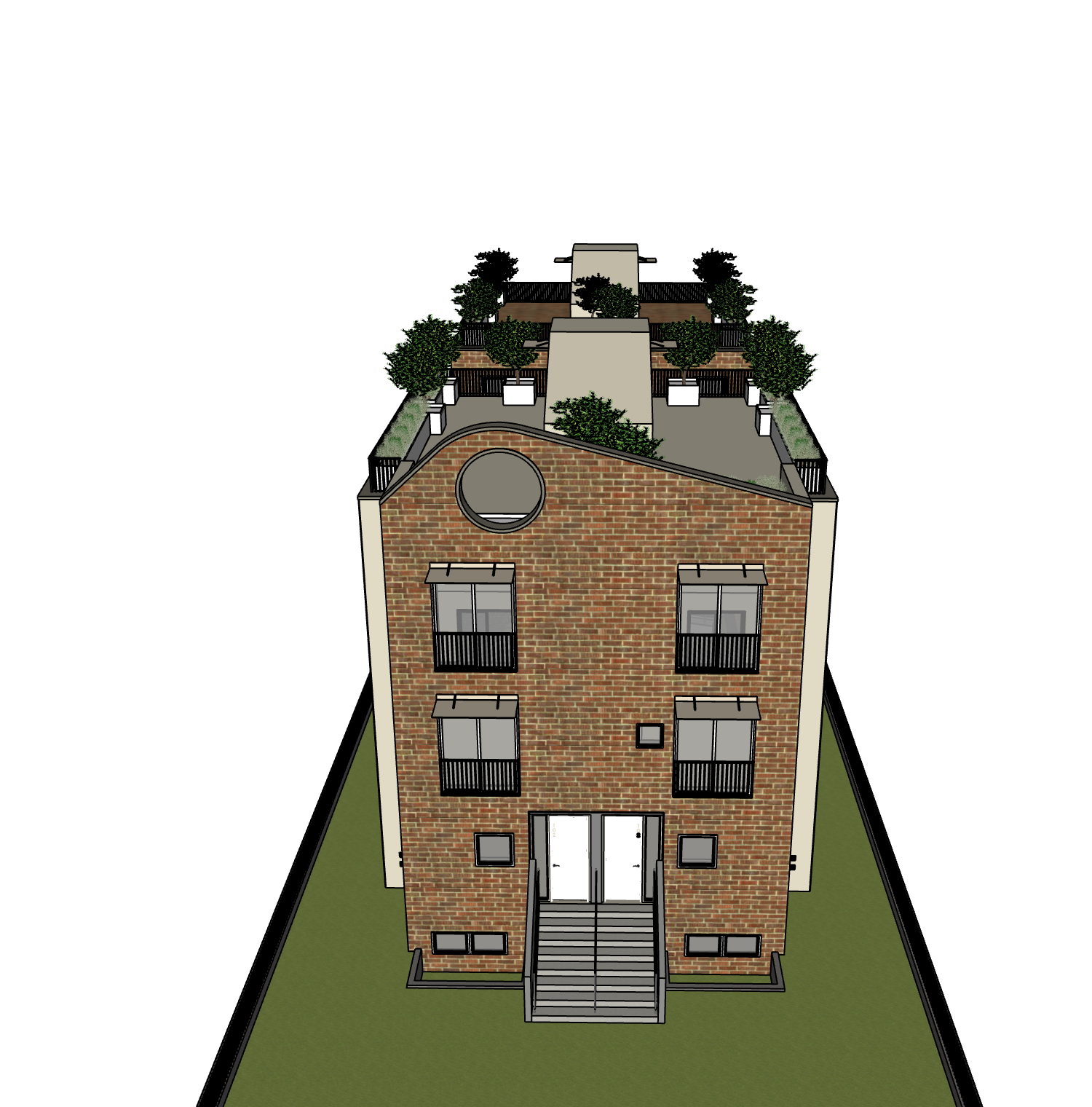 use the uploaded image strictly for geometry proportions window placement roofline stairs and composition do not alter the building structure or redesign any architectural elements use the reference image only for material realism lighting quality shadow depth and overall photographic mood do not copy any architectural features from the reference convert the uploaded building into a realistic architectural photograph with the same level of surface detail lighting behavior and environmental realism as the reference image front fa ade material red interlocking square shingles arranged in a brick like running pattern these are shingles not brick introduce subtle tonal variation natural seams slight irregularities and realistic surface depth side wall smooth modern gray panel material with subtle joints and soft natural shadow gradients railings black powder coated steel with realistic reflectivity and minor wear glass natural outdoor reflections from surrounding buildings and trees balanced glare realistic transparency stairs poured concrete with subtle aggregate texture and natural edge wear lighting natural midday sunlight with defined but realistic shadow direction soft ambient bounce light no flat cg lighting environment realistic urban residential context with similar height apartment buildings nearby natural landscaping variation subtle sidewalk texture and real outdoor atmosphere camera architectural photograph shot at street level with a 50mm full frame lens at f 5 6 natural depth slight lens distortion no render style sharpness color grading natural daylight color science no hdr no hyper polished rendering look make this look like a real photograph taken outdoors not a 3d render