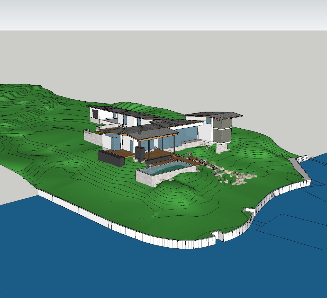aerial architectural rendering of a contemporary lakehouse residence on inks in the texas hill country late summer afternoon light south facing drone view over the lake looking back at the house calm blue green water at normal level with gentle wind ripples shoreline has a concrete bulkhead with native grasses above the lake is positioned in the foreground add a boat house connecting to the shore with a boat in the water rolling texas terrain with scattered live oaks and ashe juniper dry golden grasses with some green pockets prickly pear accents warm atmospheric haze over distant low hills the lakehouse sits lightly on the site with a refined modern material palette white stucco siding light gray standing seam metal roofing exposed timber rafter tails retain the exact structure window arrangement rooflines foundation height and proportions exactly as shown in the reference image minimal site disturbance native drought tolerant landscaping natural pathways photoreal architectural visualization ultra realistic lighting crisp shadows crisp building edges high detail vegetation and ground textures glass reflections and a vibrant clear sky with light atmospheric depth render in hyper realistic architectural visualization quality 8k resolution