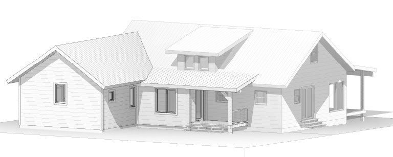 the siding is grey in color the roof is a darker grey standing seam metal the windows are white the porch and column are a light brown wood