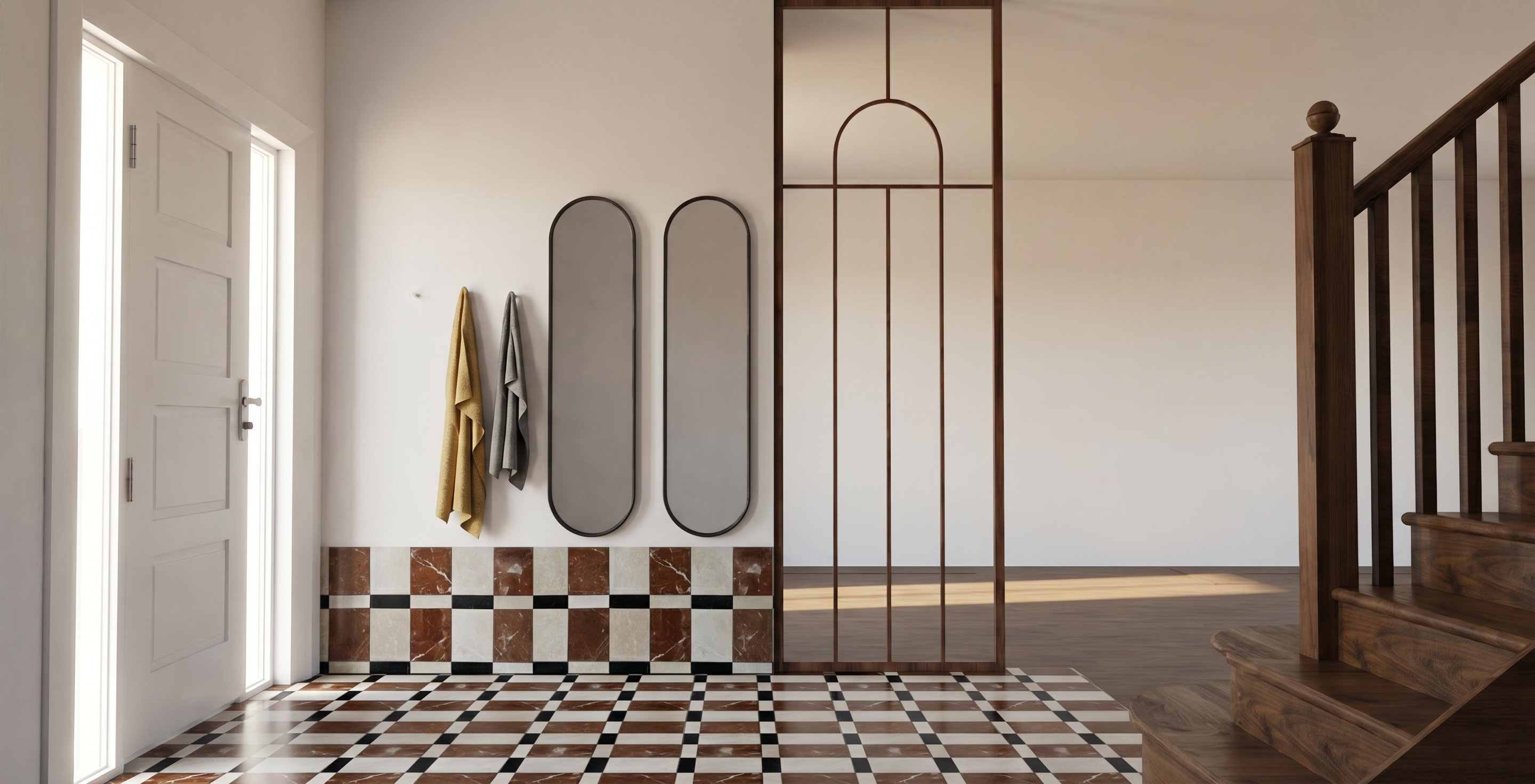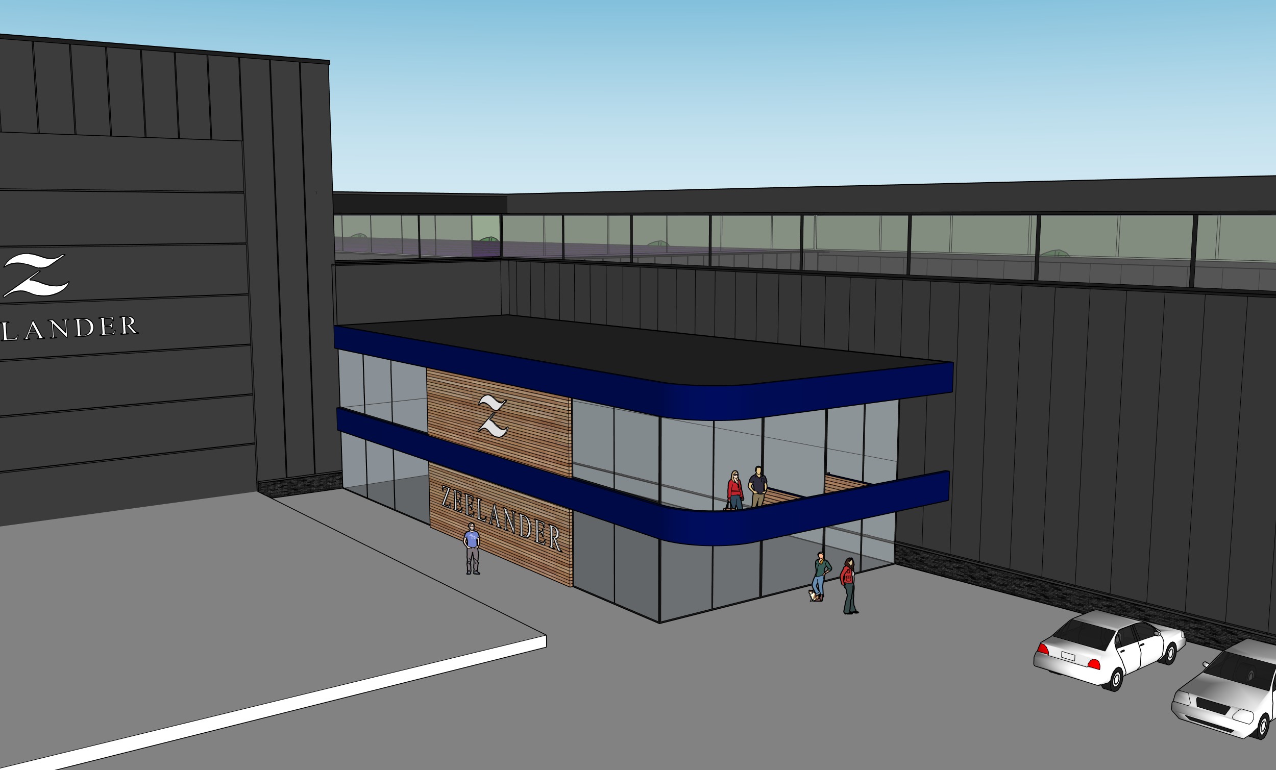 the weather is sunny with a few clouds make the cars and boats look realistic keep the materials and colours of the buildings exactly the same as in the original add some people around the buildings also add some plants in pots in front of the entry
