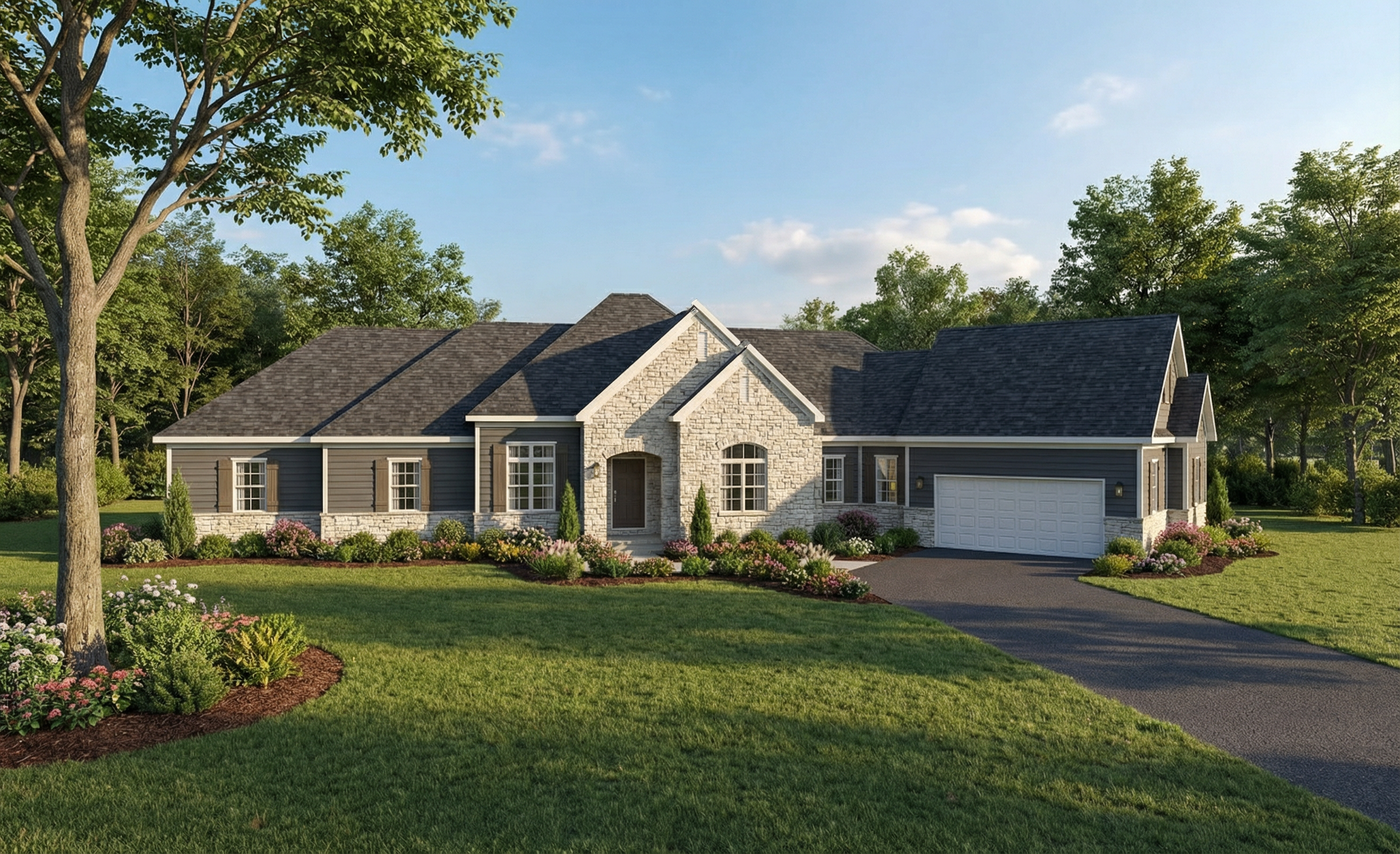 make as photorealistic as possible while keeping textures the same as selection professional landscaping in a lightly wooded scene with good lighting dark blue grey siding dark shingle roof only