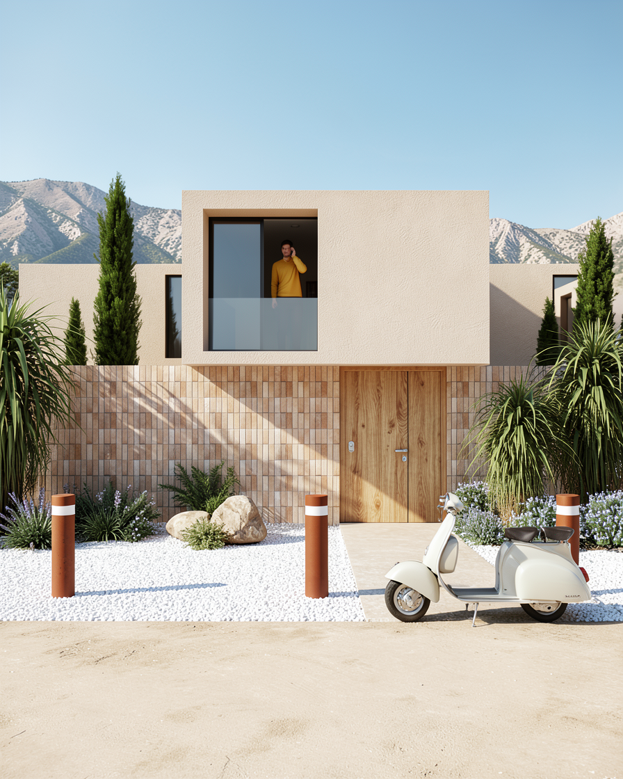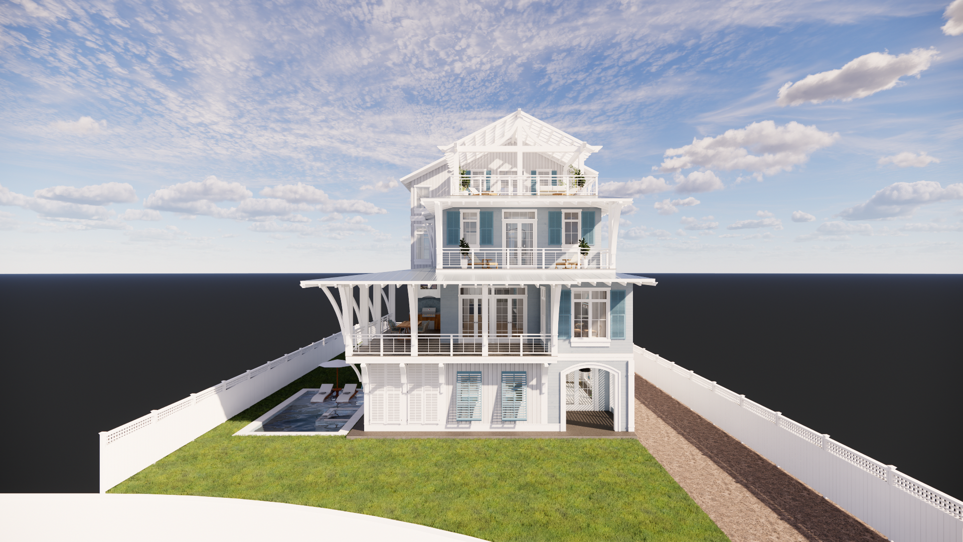 you are a professional image renderer you create the highest grade renderings around and specialize in architectural renderings this is the front elevation of a beach house create a high resolution photorealistic image of this structure keep the windows as they are where they are keep the doors as they are where they are keep the main structure as it is where it is feel free to change the perspective keep the roofline as it is where is it do not add anything to the structure that i have not asked for the roof is standing seam metal galvalume the background will be a coastal shoreline it should be early afternoon with a bright sunny day clear skies the landscaping should be late summer with plenty of color and should be that of a luxury beach estate