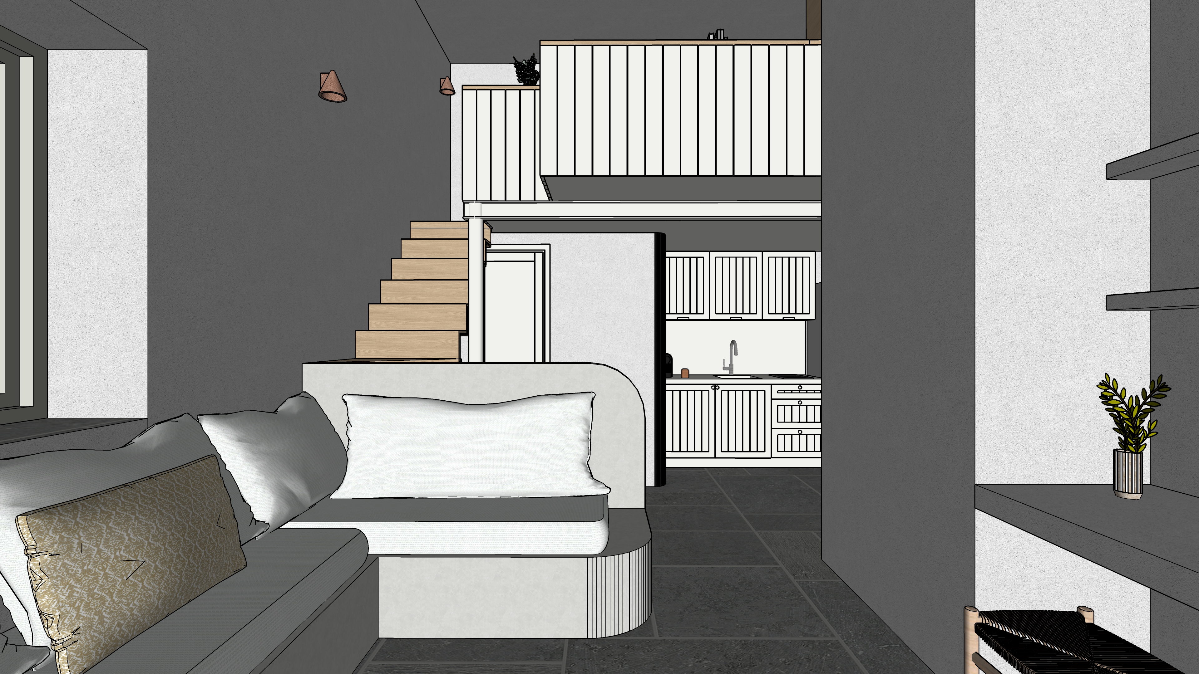 main prompt this is a cycladic house in kythnos the floor is natural gray pelion stone the sofa is white cement paint the sofa fabrics are light cream there is wooden stair leading to the mezzanine which is made of metal and wood in white color the stair is light oak wood the window frames are sage green the walls are white there is natural light negative prompt do not change geometry do not add objects do no change colors or materials