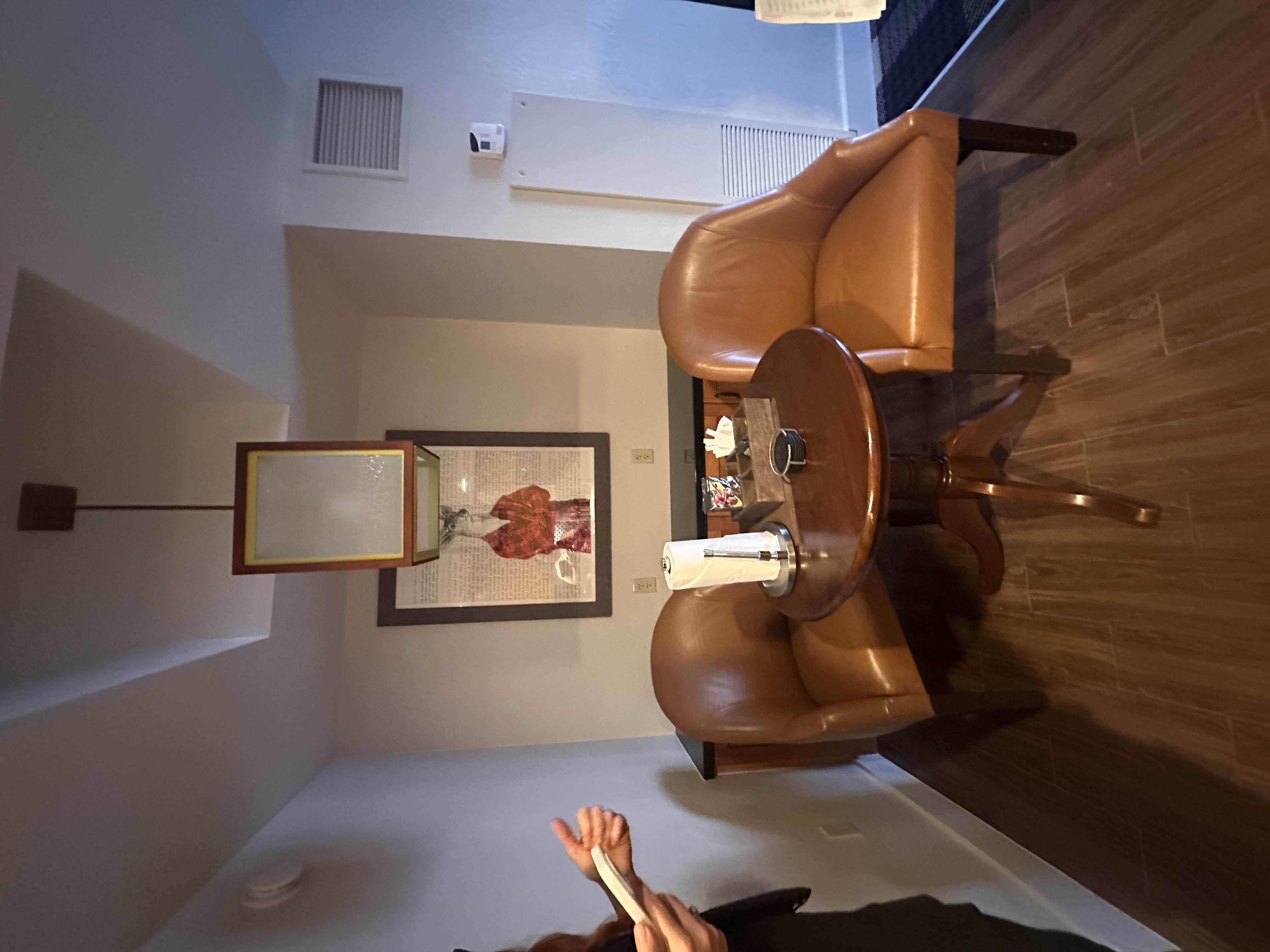 straighten out the dining chairs remove the items on the table top and remove the person on the left edge of the image