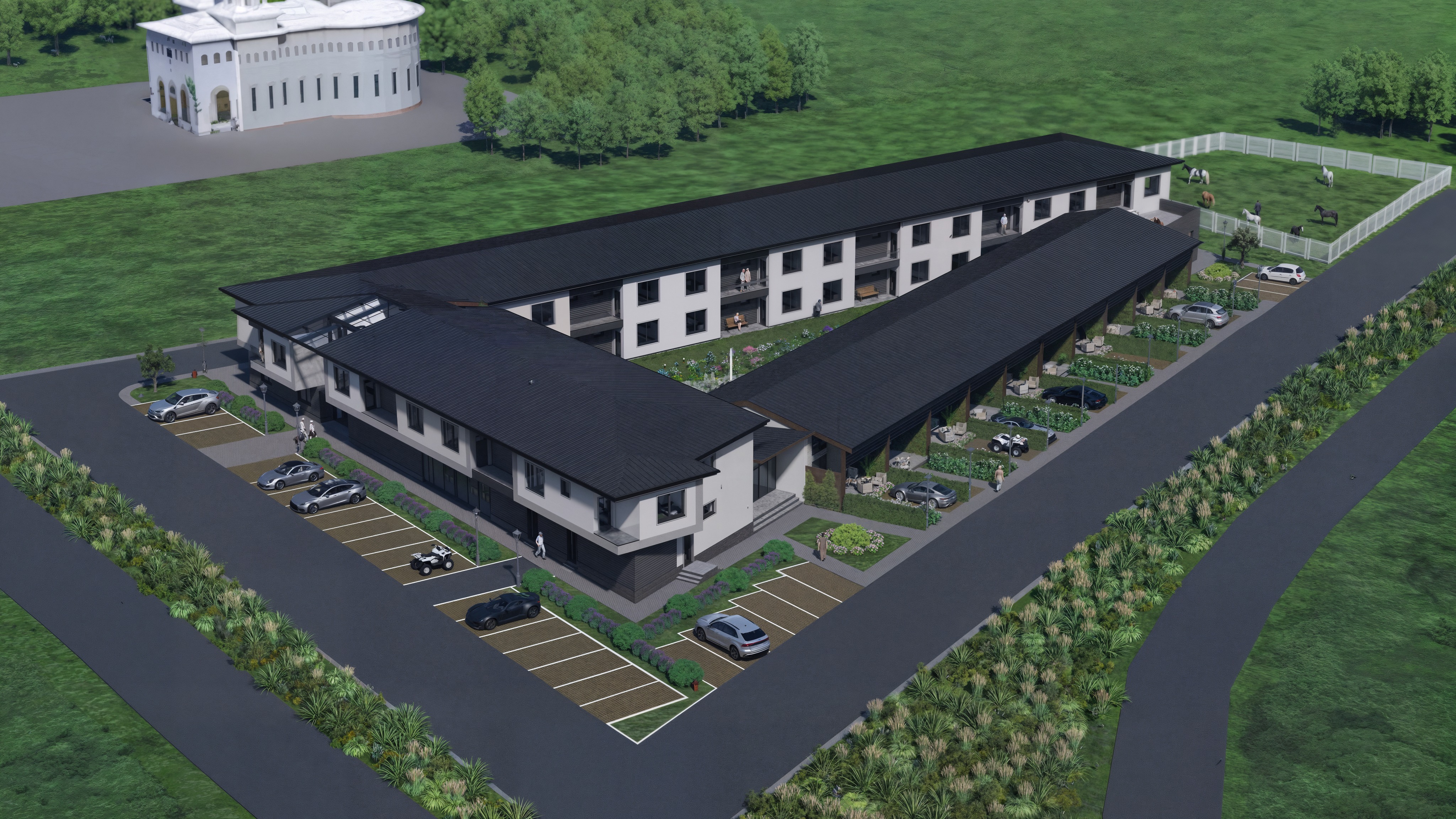 aerial view of a modern senior residence complex with a u shaped layout seen from above at a slight angle the building has clean white plaster facades dark pitched roofs and warm wood accents a central courtyard with greenery and seating areas is visible inside the u shape along one side there are covered terraces with private garden areas and small parking spaces in front cars are parked along the access road the environment is a calm rural setting with open green fields soft landscaping and a simple road surrounding the property lighting is soft and warm coming from a higher sun angle behind the camera evenly illuminating the facades without strong shadows the scene has a bright clean premium real estate look natural colors balanced light no dramatic contrast interior lights are softly visible adding warmth without making the scene dark highly detailed realistic materials clean composition architectural visualization style sharp and crisp image