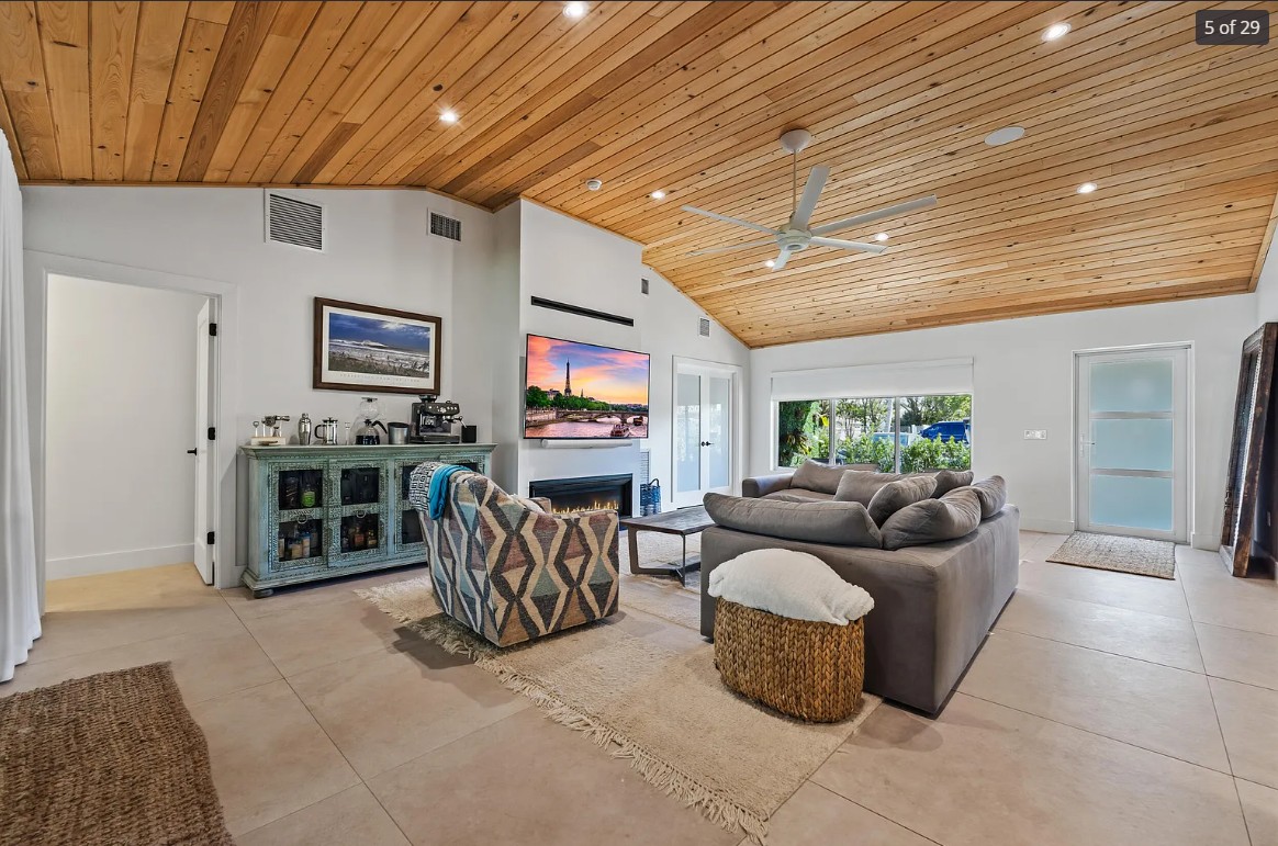 remove existing furniture add a clean streamlined double chaise sectional in beige add a square ottoman in navy and taupe beige rug add floating wine modern shelving on the fireplace walls place a wood round dining table and 4 modern navy and cream dining arm chairs with casters