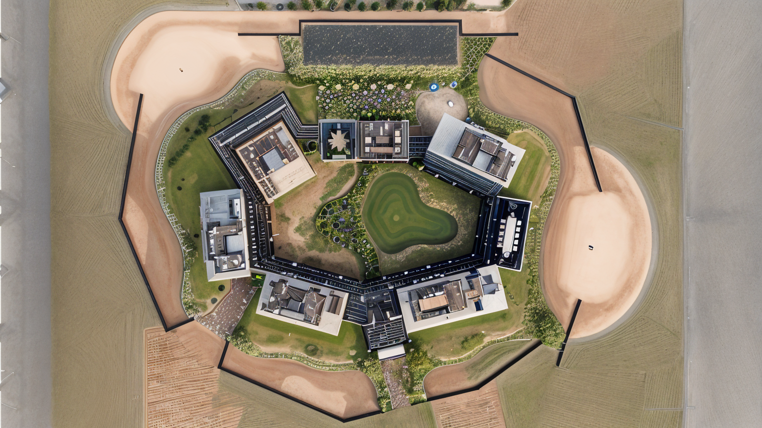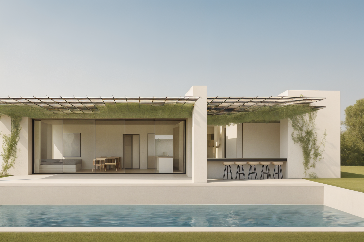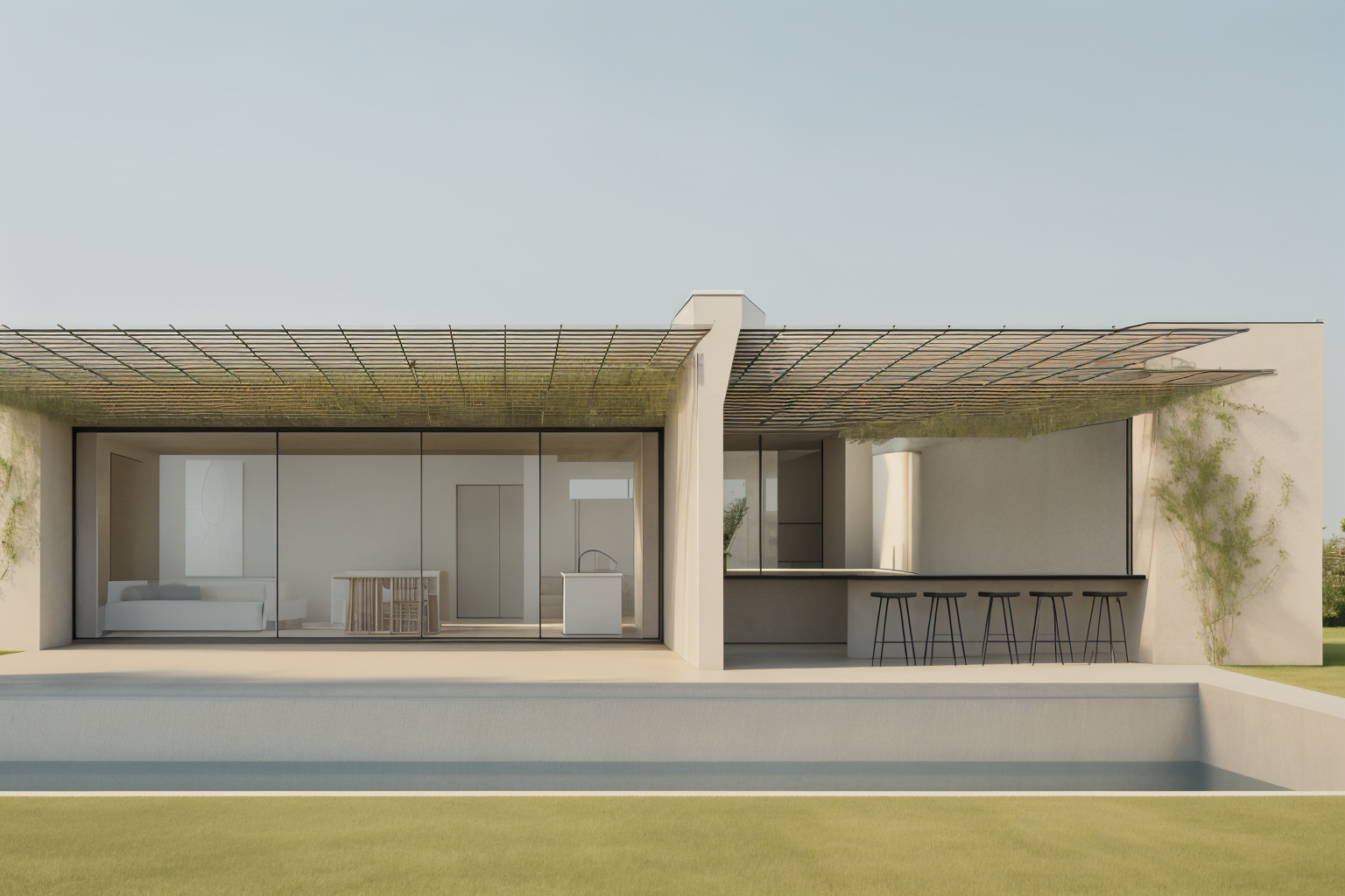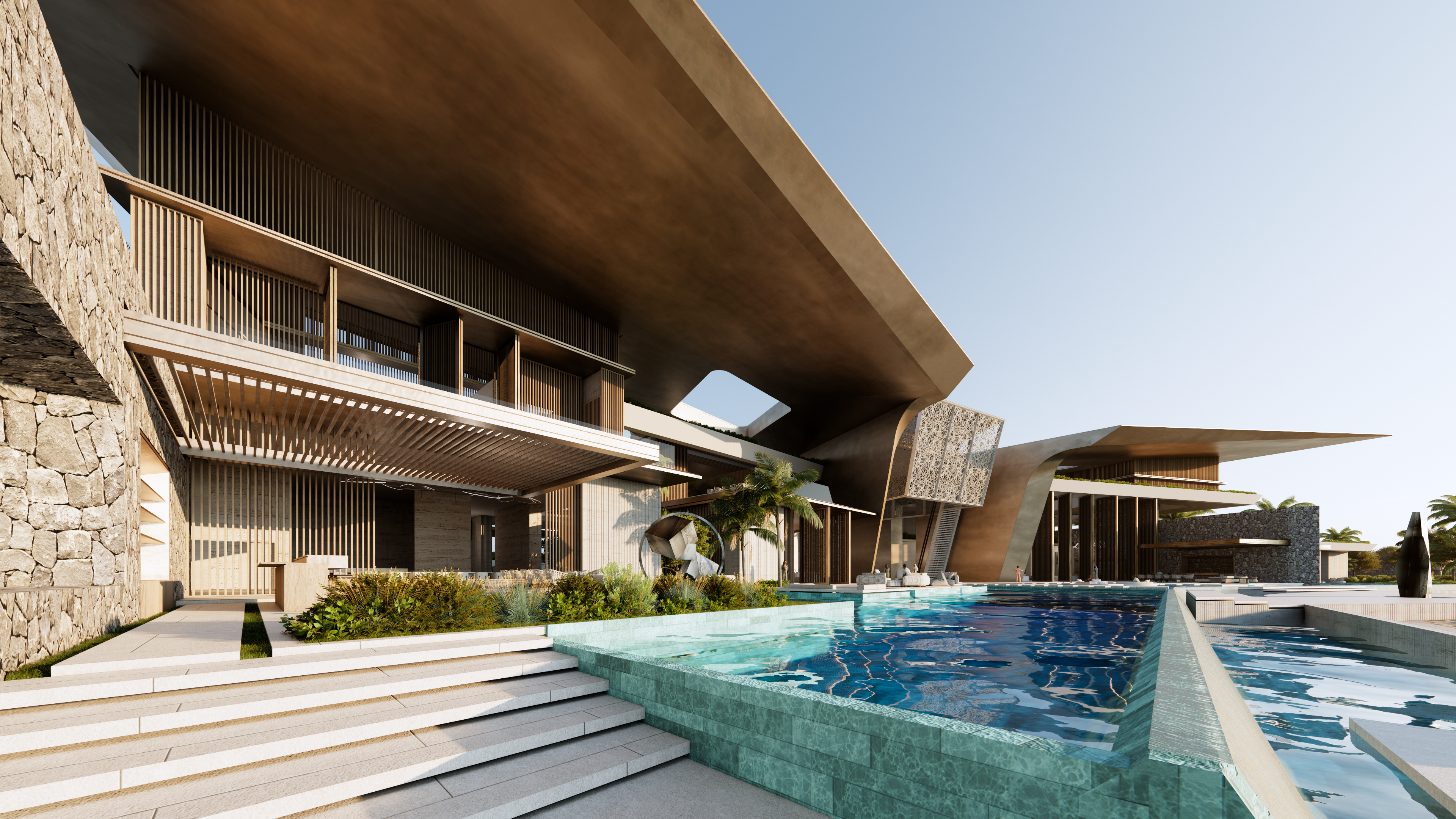 a modern architectural masterpiece with bold geometric structures featuring a sweeping roof in rich bronze set against a clear blue sky the walls and structures incorporate textured stone in warm earth tones complemented by wooden accents in a deep natural brown the foreground showcases an inviting pool with the water in shades of turquoise and deep blue surrounded by lush greenery with vibrant green foliage the overall atmosphere is tranquil and luxurious bathed in soft natural sunlight