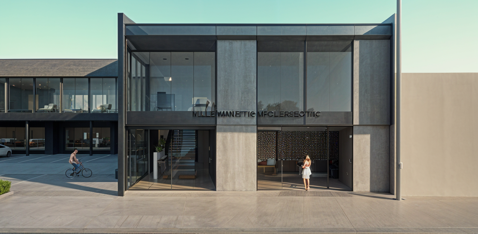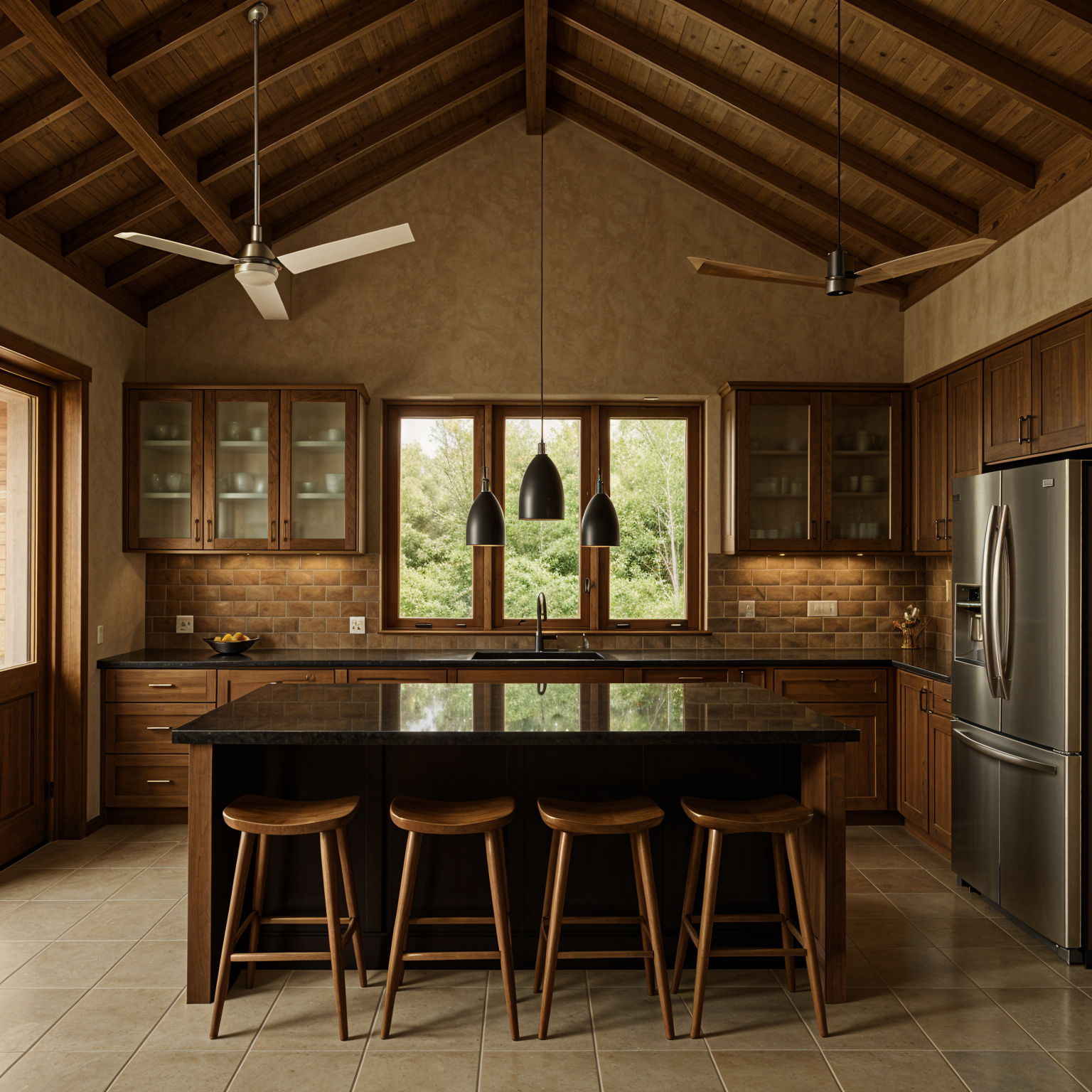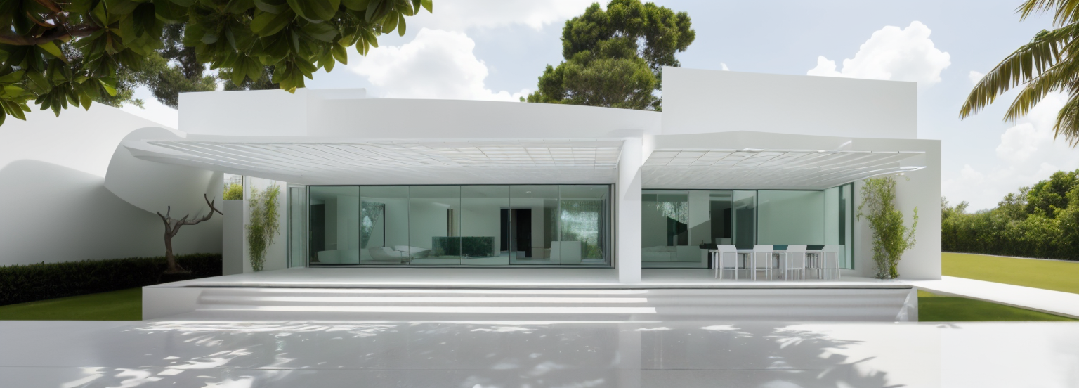 a modern architectural masterpiece with bold geometric structures featuring a sweeping roof in rich bronze set against a clear blue sky the walls and structures incorporate textured stone in warm earth tones complemented by wooden accents in a deep natural brown the foreground showcases an inviting pool with the water in shades of turquoise and deep blue surrounded by lush greenery with vibrant green foliage the overall atmosphere is tranquil and luxurious bathed in soft natural sunlight