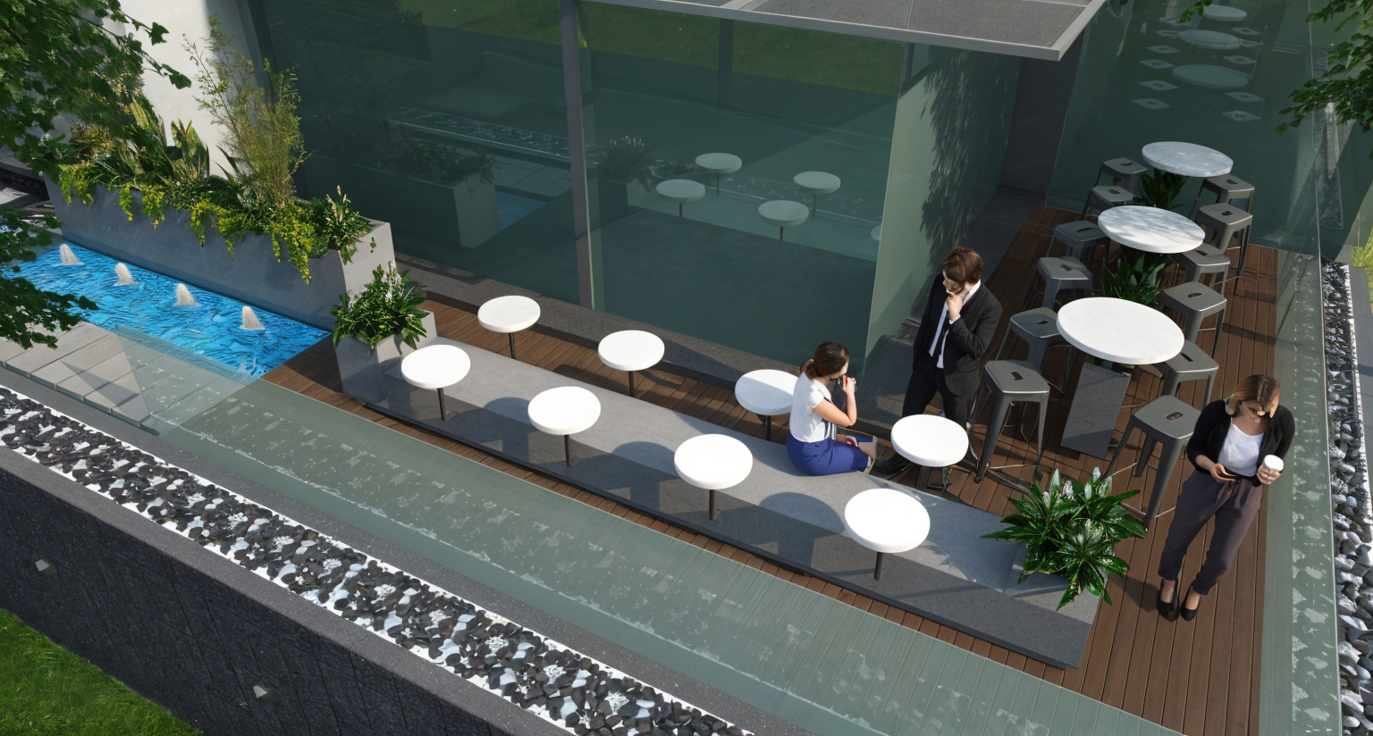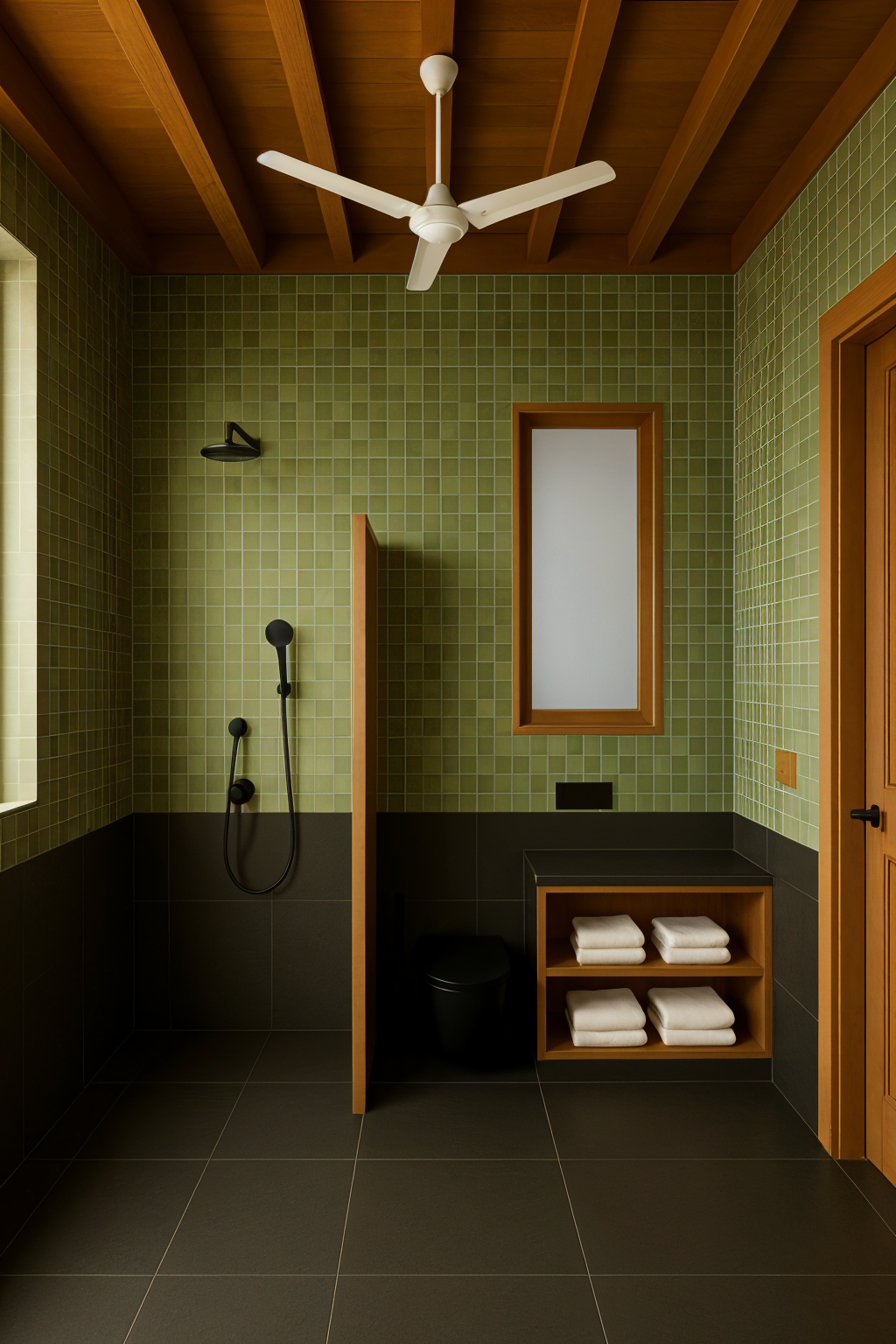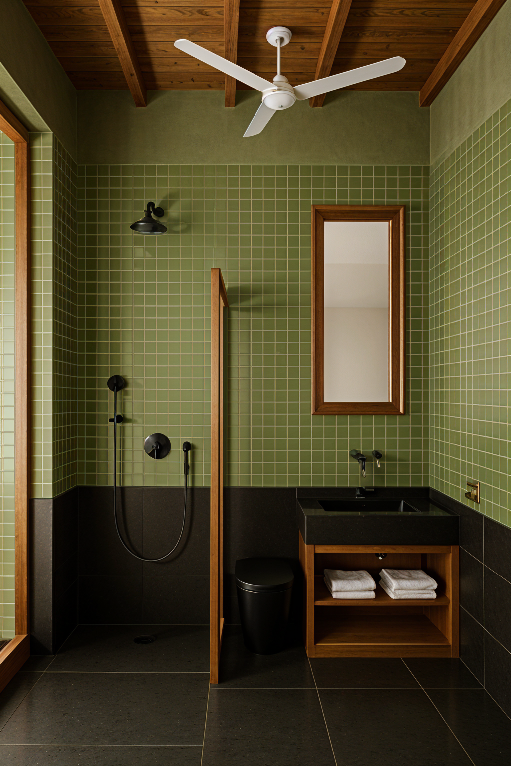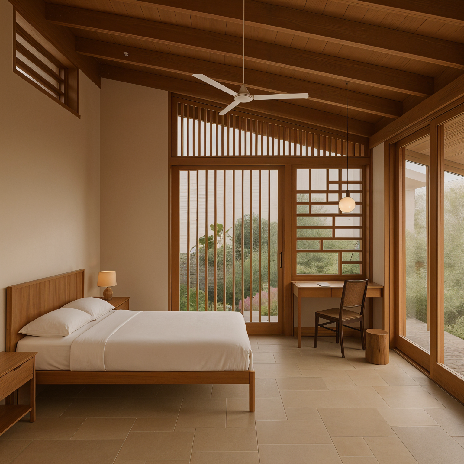 a modern architectural masterpiece with bold geometric structures featuring a sweeping roof in rich bronze set against a clear blue sky the walls and structures incorporate textured stone in warm earth tones complemented by wooden accents in a deep natural brown the foreground showcases an inviting pool with the water in shades of turquoise and deep blue surrounded by lush greenery with vibrant green foliage the overall atmosphere is tranquil and luxurious bathed in soft natural sunlight