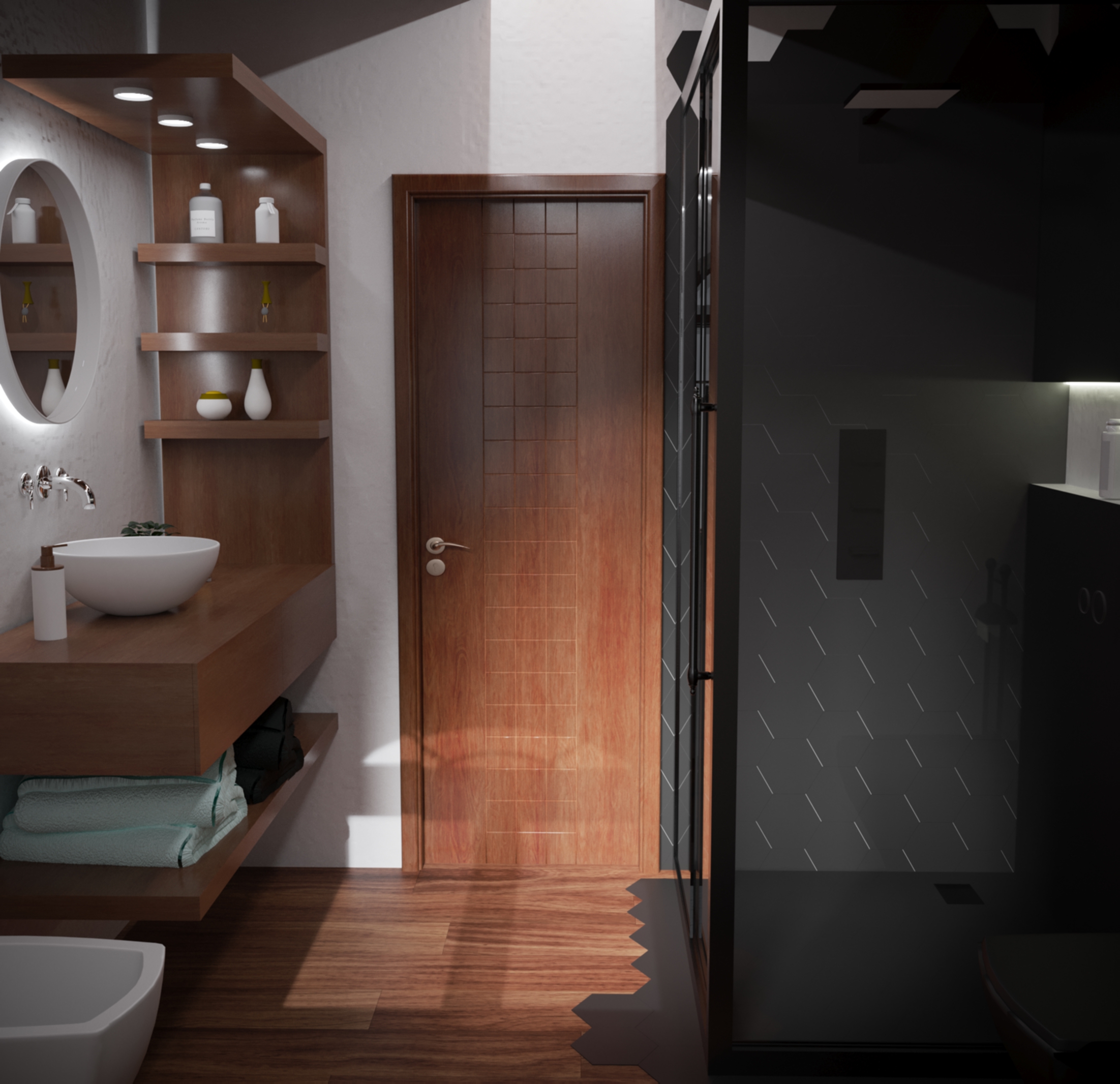 interior shot modern luxury house with a sleek contemporary design the exterior features a dark charcoal color contrasted by light beige accents the facade includes large glass windows with shimmering reflections three luxury sports cars in vibrant glossy red and black are parked in the sleek dark garage lush greenery surrounds the house with vibrant green palm trees to the left adding a tropical touch the pathway and steps are light gray leading up to a stylish entrance door the sky is a rich deep blue enhancing the tranquil and upscale atmosphere
