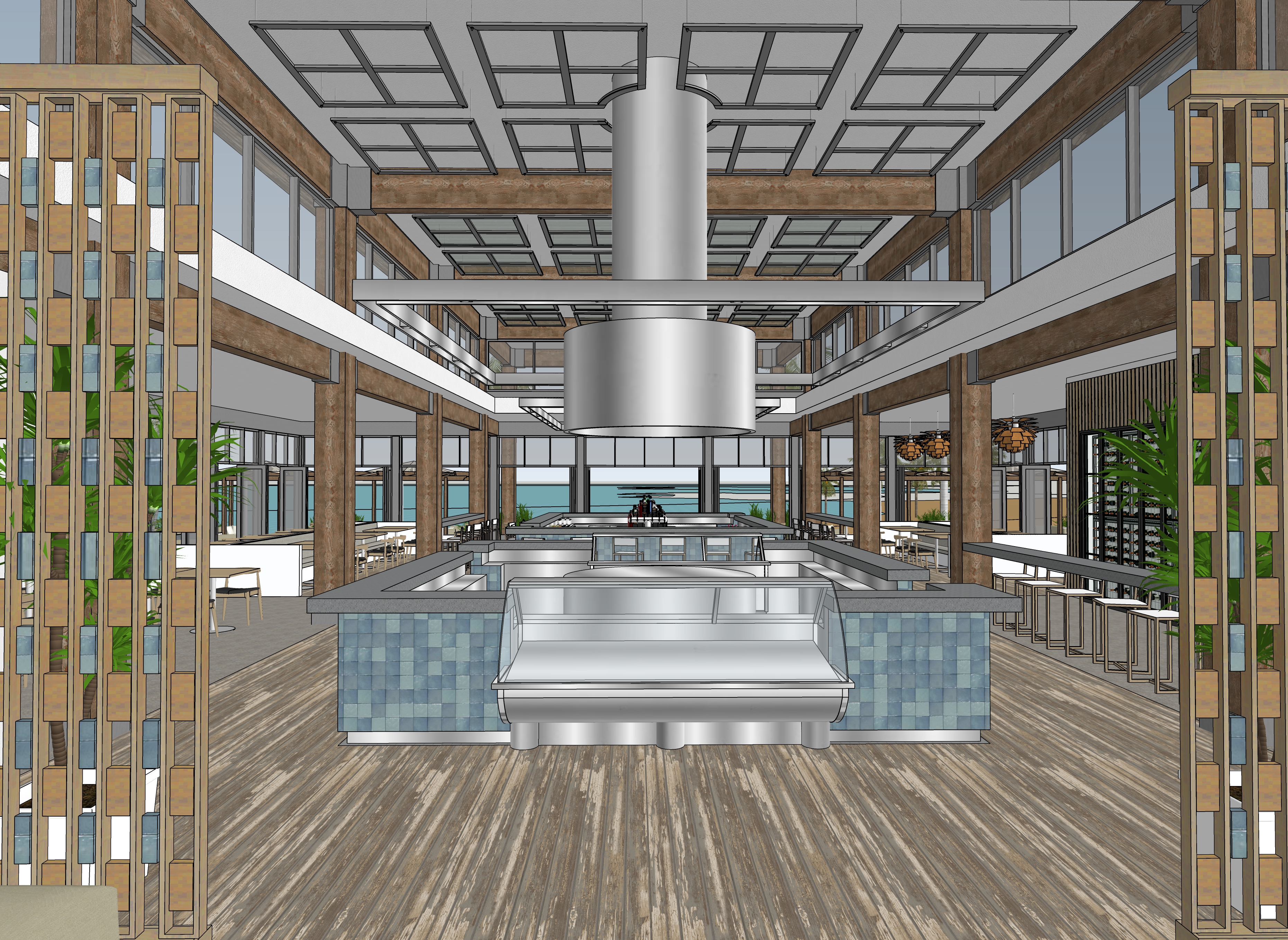 evening view location is a beach resort on the red sea egypt the views beyond the building are of the horizon over the water with setting sun lighting add low level lighting effects to the inside of the restaurant add people sitting the restaurant at the tables and stools add drinks and food to the tables and bars add seafood on a bed of ice in the display cooler add a chef cooking at the circular grill light up the wine bottles in the glass display cases the columns and beams are made of heavy wood timber add up lighting the the ceiling add people sitting at the bar on the stools by the wine display cases keep the perspective view in the source image add three sailboats on the sea near the horizon keep the decorative screens in the foreground at the left and right side of the original view keep the lighting from the last rendering add a wine sommelier by the wine display cases make the square suspended lighting over the bars stainless steel material add a man and a woman looking into the display case on the right side add a waiter carry a tray of seafood entrees on the left side of the view add some steam rising from the grill where the chef is cooking the bar counter tops are dark granite in a matte finish