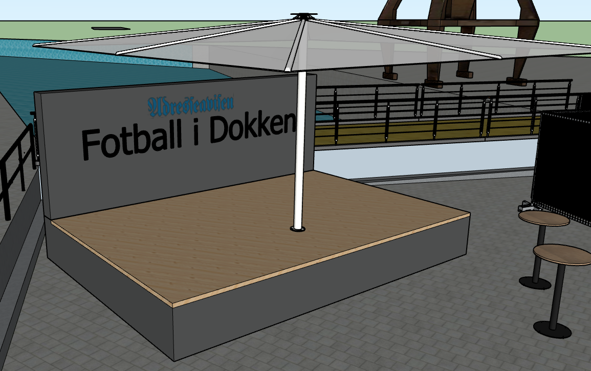 use the provided image as the exact base for layout proportions and camera angle replace the back wall with wide vertical wooden boards natural outdoor wood with visible grain and variation add cnc cut metal letters spelling exactly fotball i dokken the letters are 52 cm tall matte black metal mounted 50 mm off the wall add a subtle warm yellow led halo behind the letters slightly visible and creating a clean glow above the text add the adressa newspaper logo as cnc cut metal letters the logo is 37 cm tall mounted closer to the wall without any lighting maintain correct spelling no distortion keep the central parasol pole and environment exactly as in the reference image scandinavian minimalistic outdoor event design realistic materials soft overcast daylight