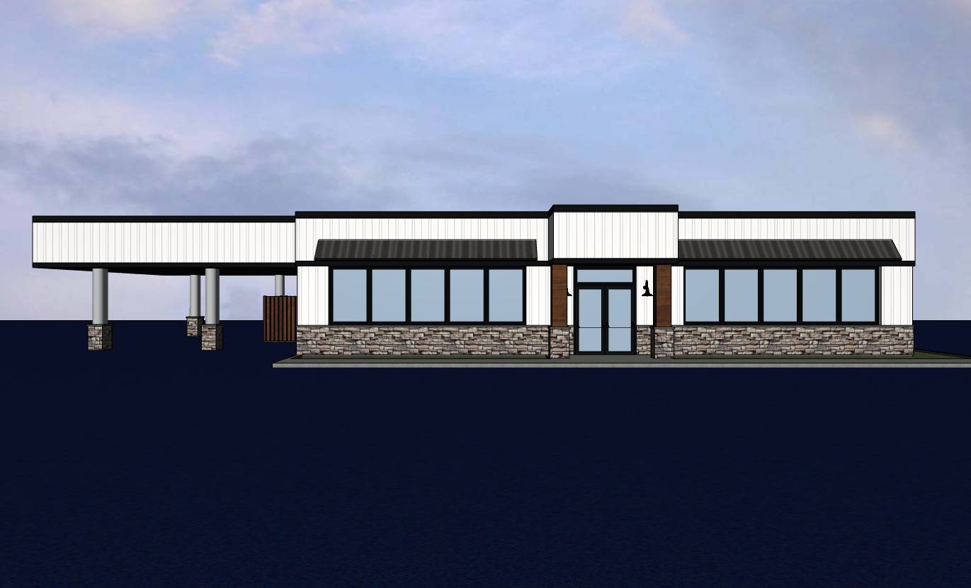 commercial building with black metal roof awnings maintain model and colors and create realistic rendering minimal landscaping on the front of building only