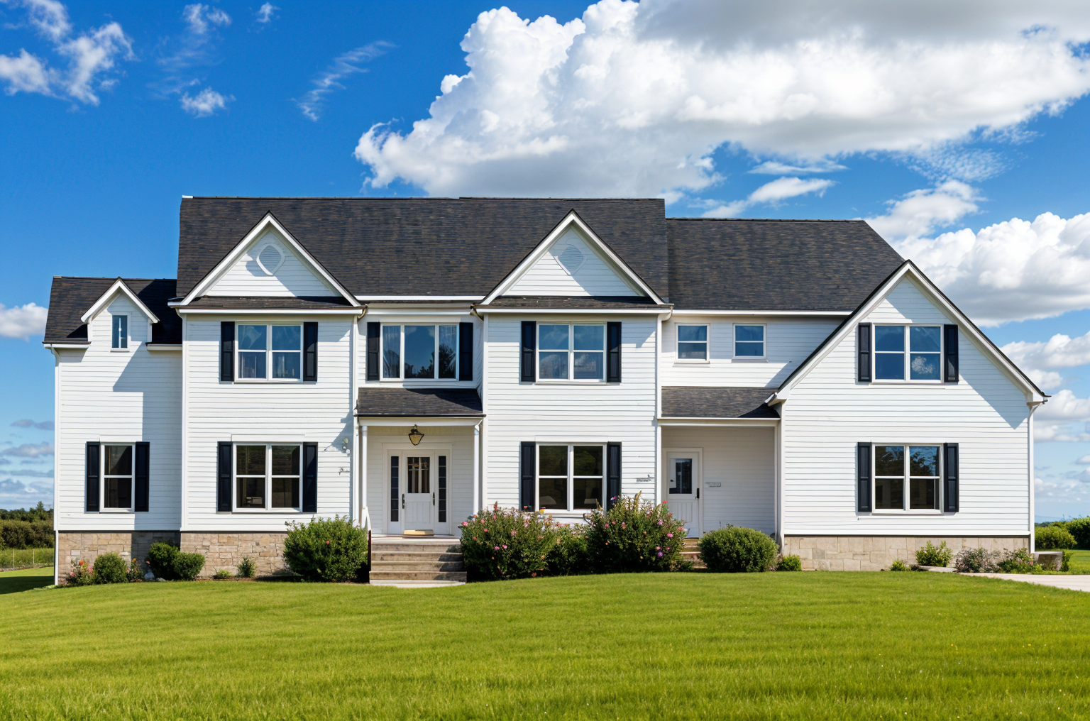 add green grass and a blue sky with clouds the house siding should be white the roof color should be a dark charcoal color the shutters should be black add small shrubs and flowers in front of the house