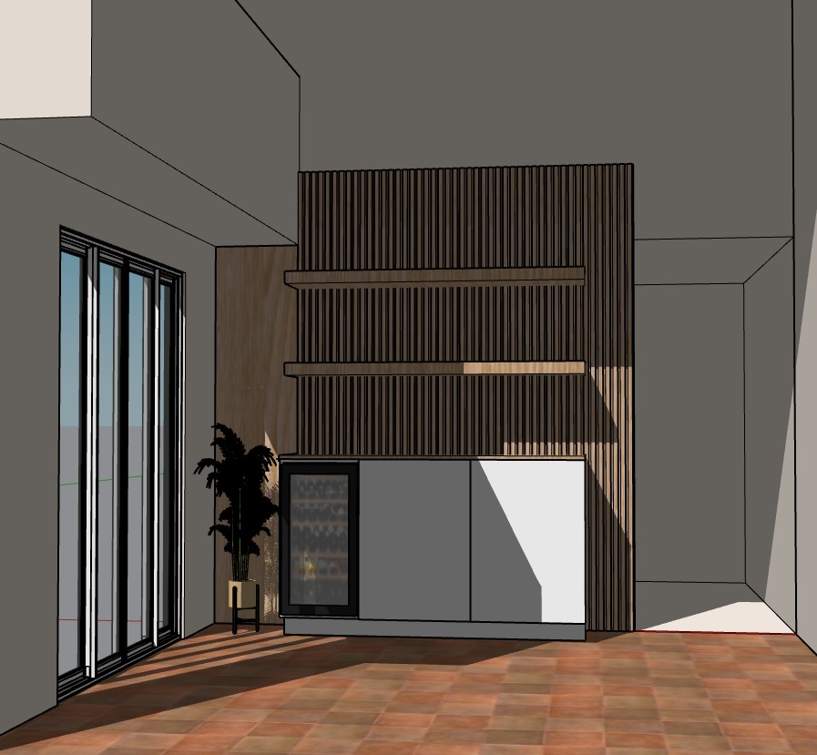 convert to a realistic render add led lights underneath floating shelves wood tone is light white wood oak ceiling is high white ceiling about 22