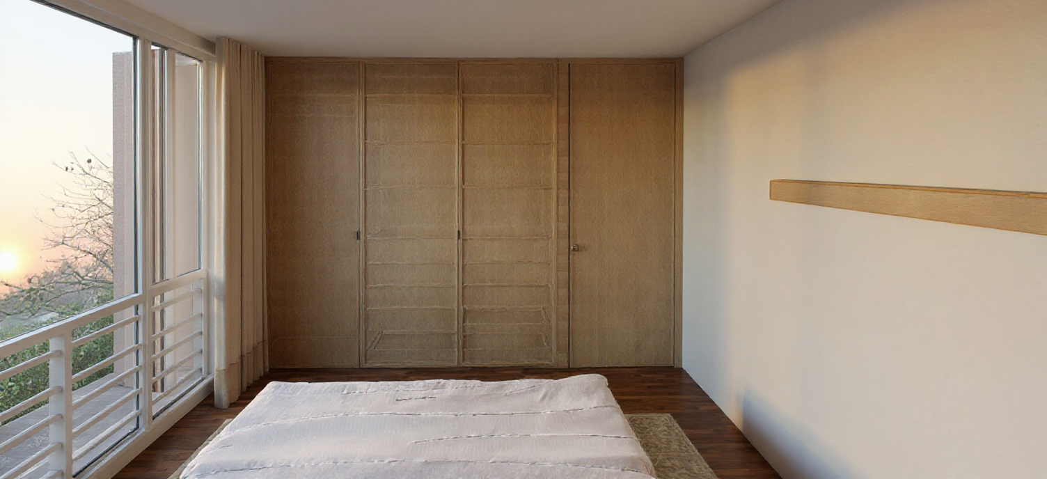 create a super realistic rendering of the bedroom keeping all the original characteristics and design details of the space the room should be very bright with strong natural lighting and sunlight entering the space combined with soft artificial lighting to make the environment even brighter maintain a warm airy and inviting atmosphere all fabrics should appear realistic and textured showing softness and material depth the wardrobe has four doors all made of thin translucent fabric with color and texture similar to woven straw with no glass and no handles the wardrobe should be closed and the doors should be transparent allowing the sense of depth and light to pass through them naturally preserve the true proportions colors materials and overall design of the existing room