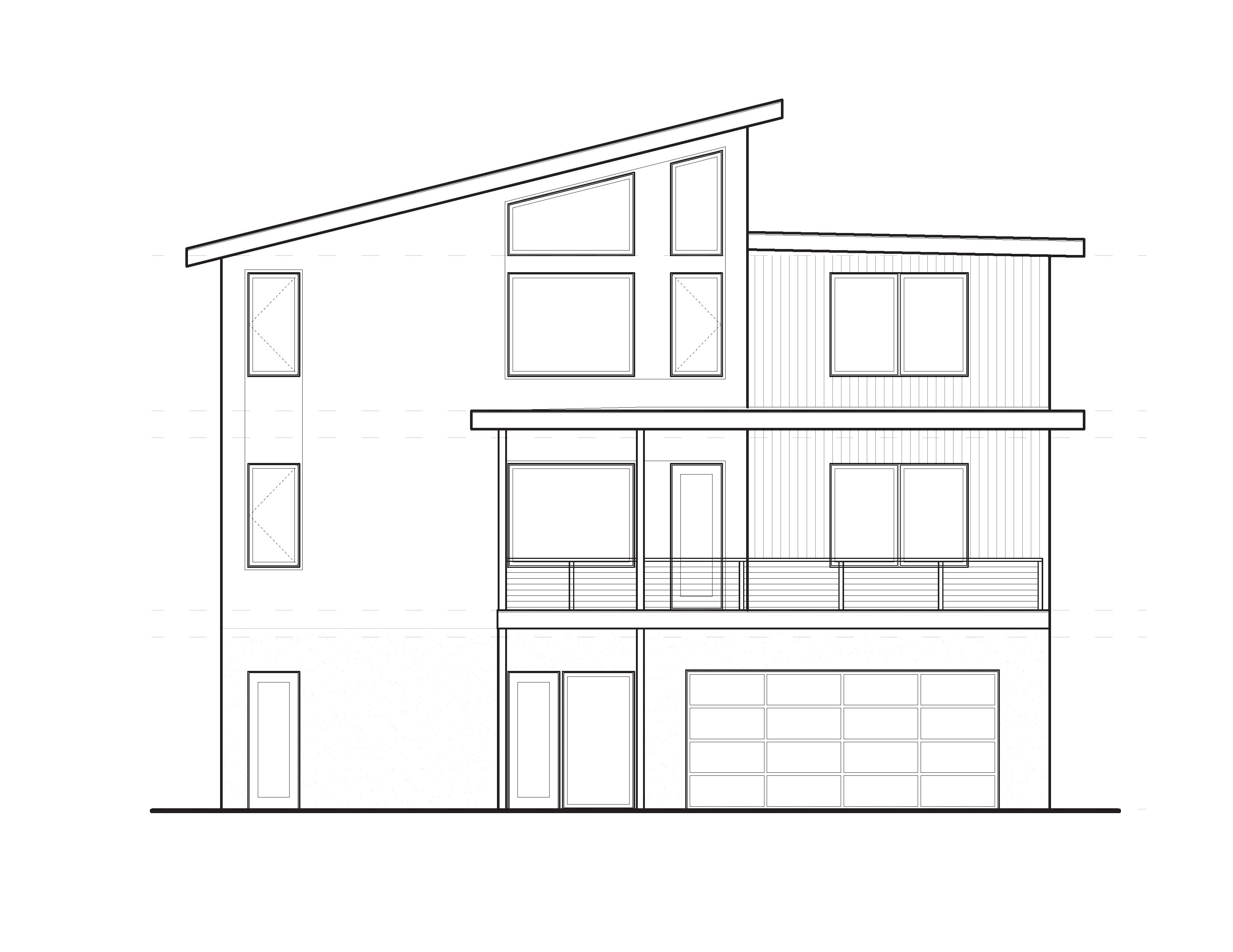 render the attached elevation in a hand drawn water colored style keep faithful to geometry window placement siding locations etc include a frosted glass garage door cast in place concrete lower level contemporary dark gray siding on the main body to the left with black trim accents around the black windows stained wood vertical siding on the upper right portion of the elevation