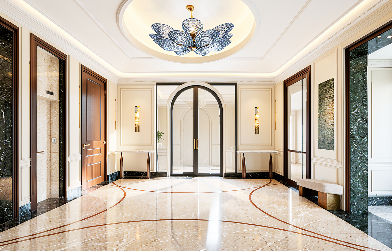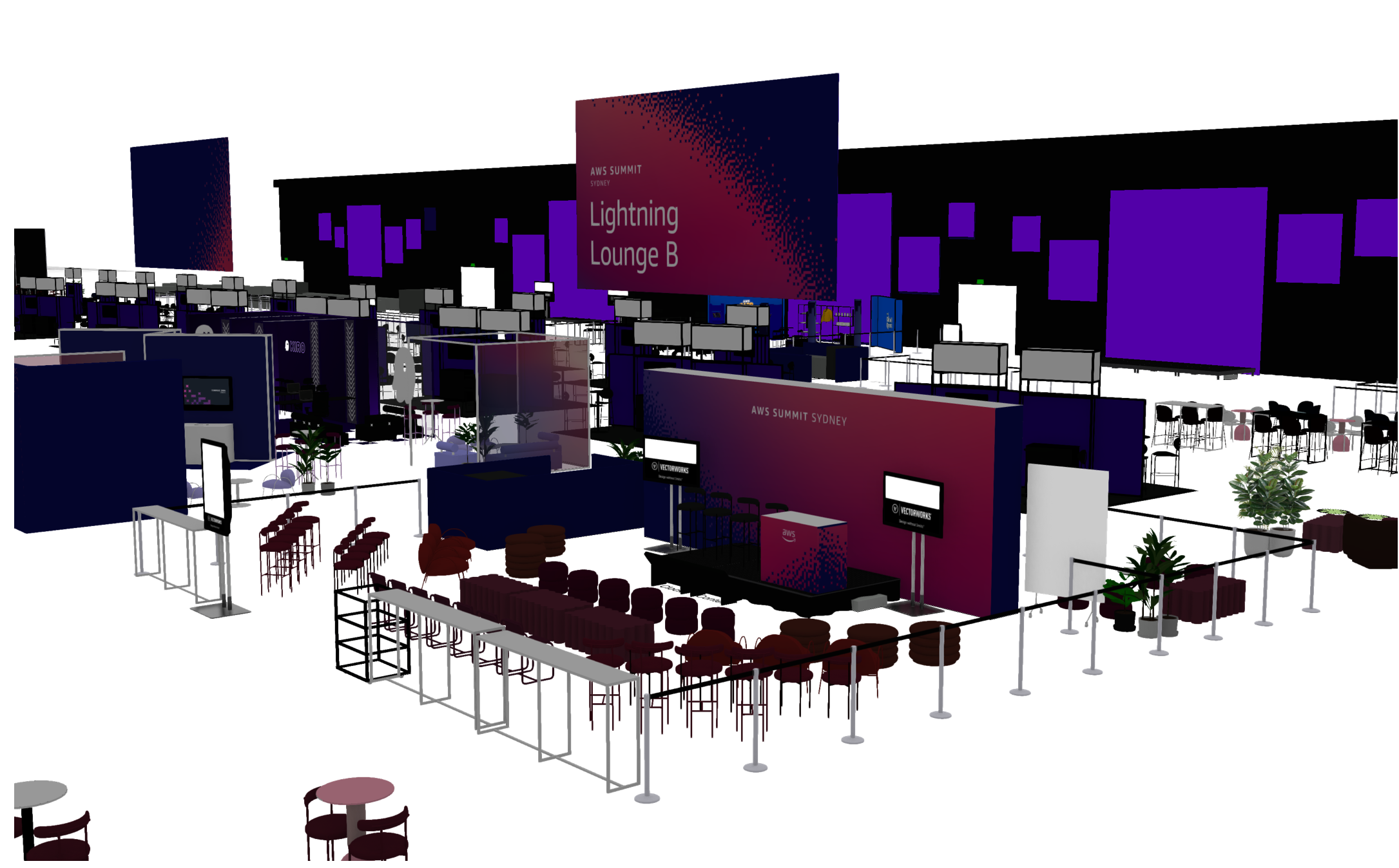 realistic dark expo environment workshop space slightly vibrant atmosphere polished concrete floor subtle light focusing on main space have business people with purple glowing headphones sitting at the seats in front of the stage wall slight blur of background have people walking past blurred light square gobo lights on floor scattered