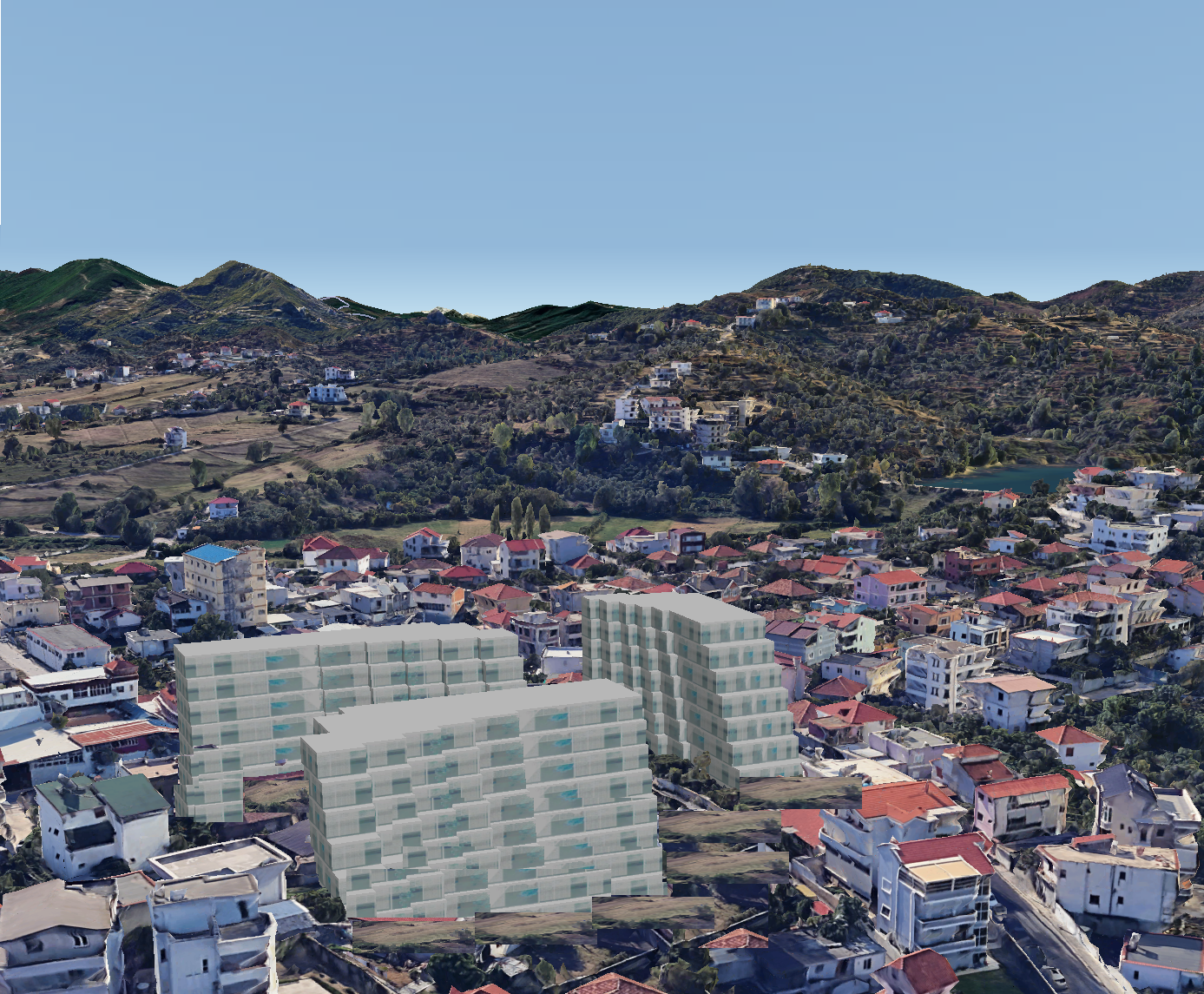 photo of modern residential buildings nestled within a suburban landscape showcasing glass facades and sleek lines emphasize textures of glass and concrete with balconies providing outdoor space the surrounding area features traditional houses with red roofs set against lush green hills bright daylight casts soft shadows enhancing the building s transparency aerial perspective with a wide angle lens captures the contrast between modernity and tradition in the urban context