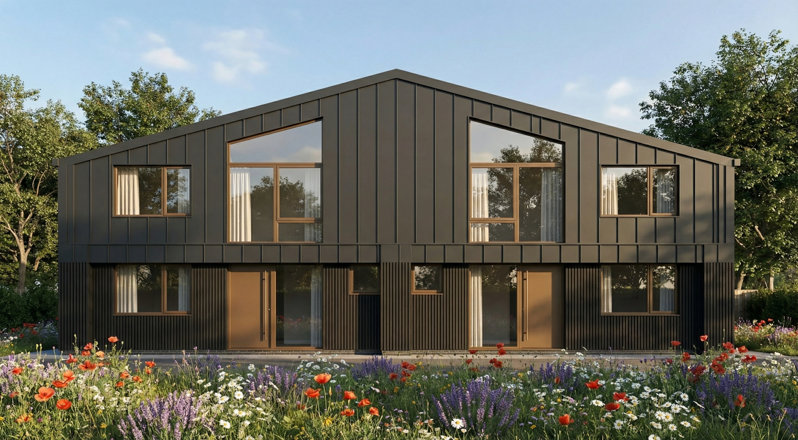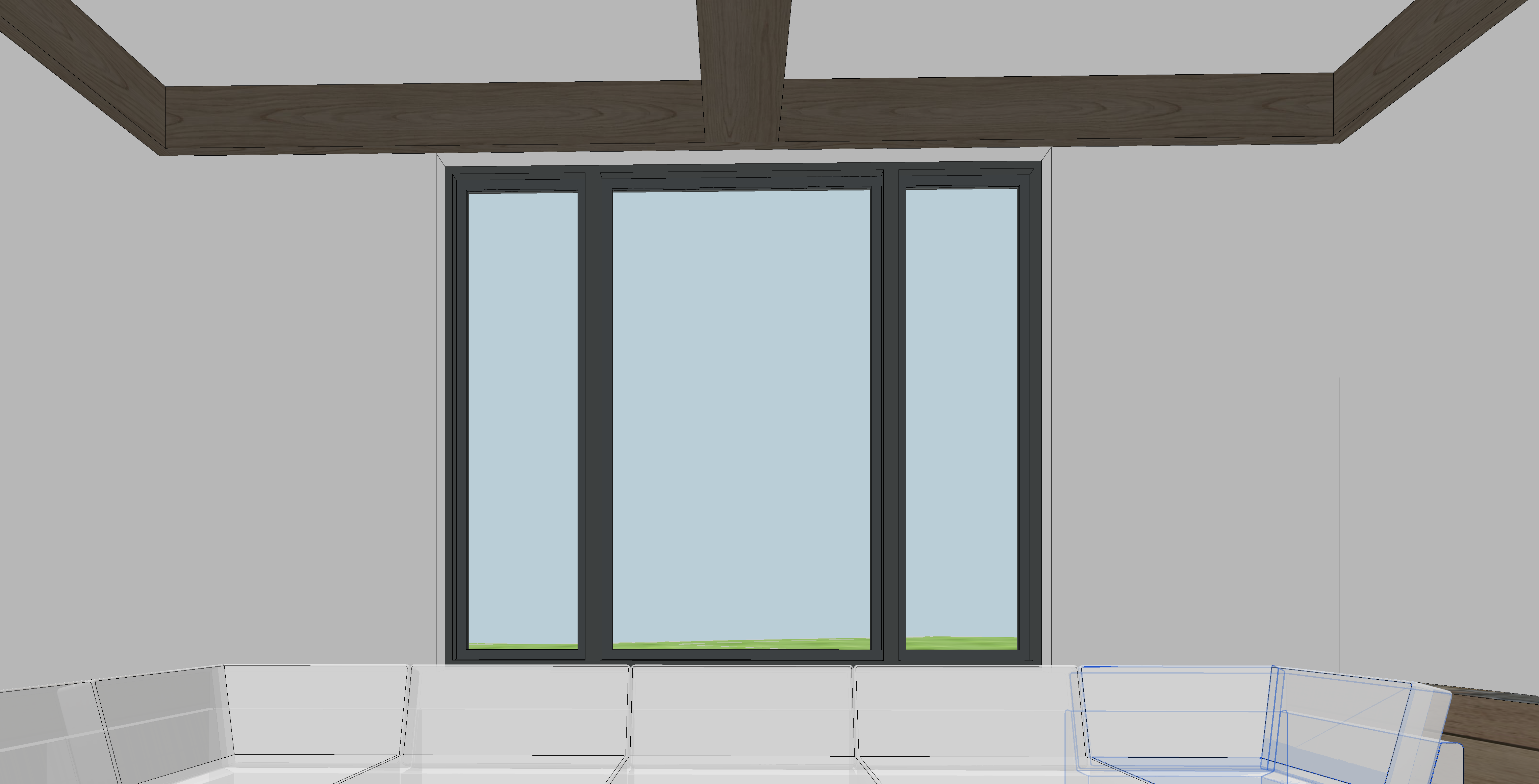 sheetrock walls sheetrock ceilings fabric couch sheetrock colored drapery hanging from perimeter beam on both sides of window