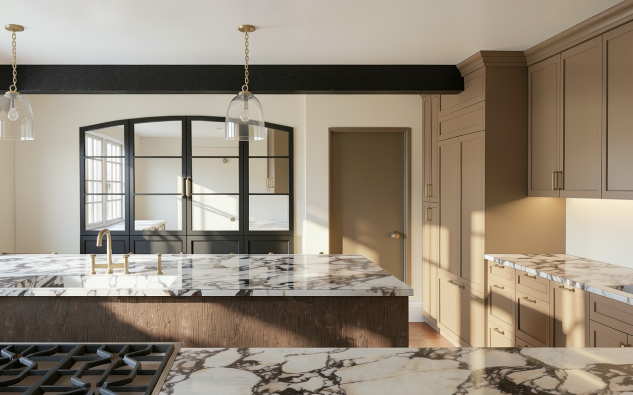 wintertime with just sky and clouds for the background and small shrubs and small pine trees in the foreground add a hot tub on the lower level patio