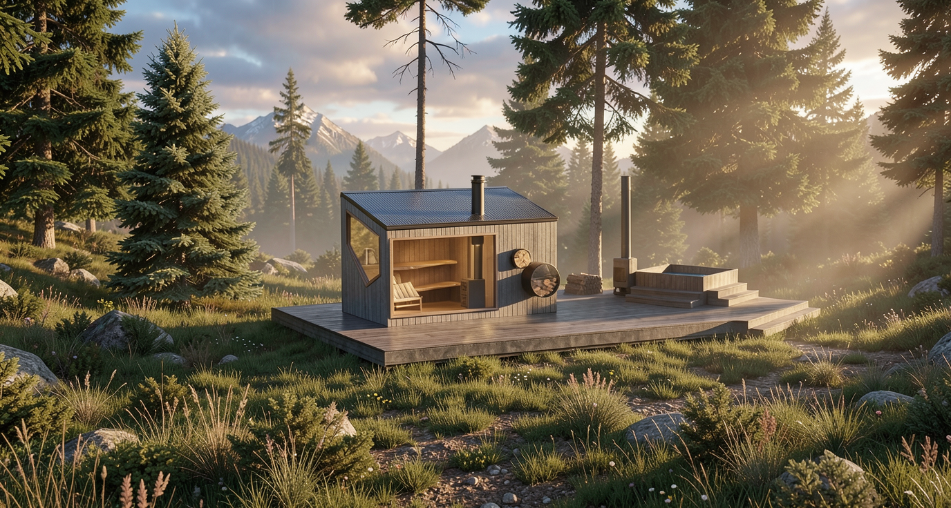 render a photorealistic 3d perspective of this sauna current material style keep model geometry the same windows doors roof sky with light atmospheric depth render in hyper realistic architectural visualization quality 8k resolution