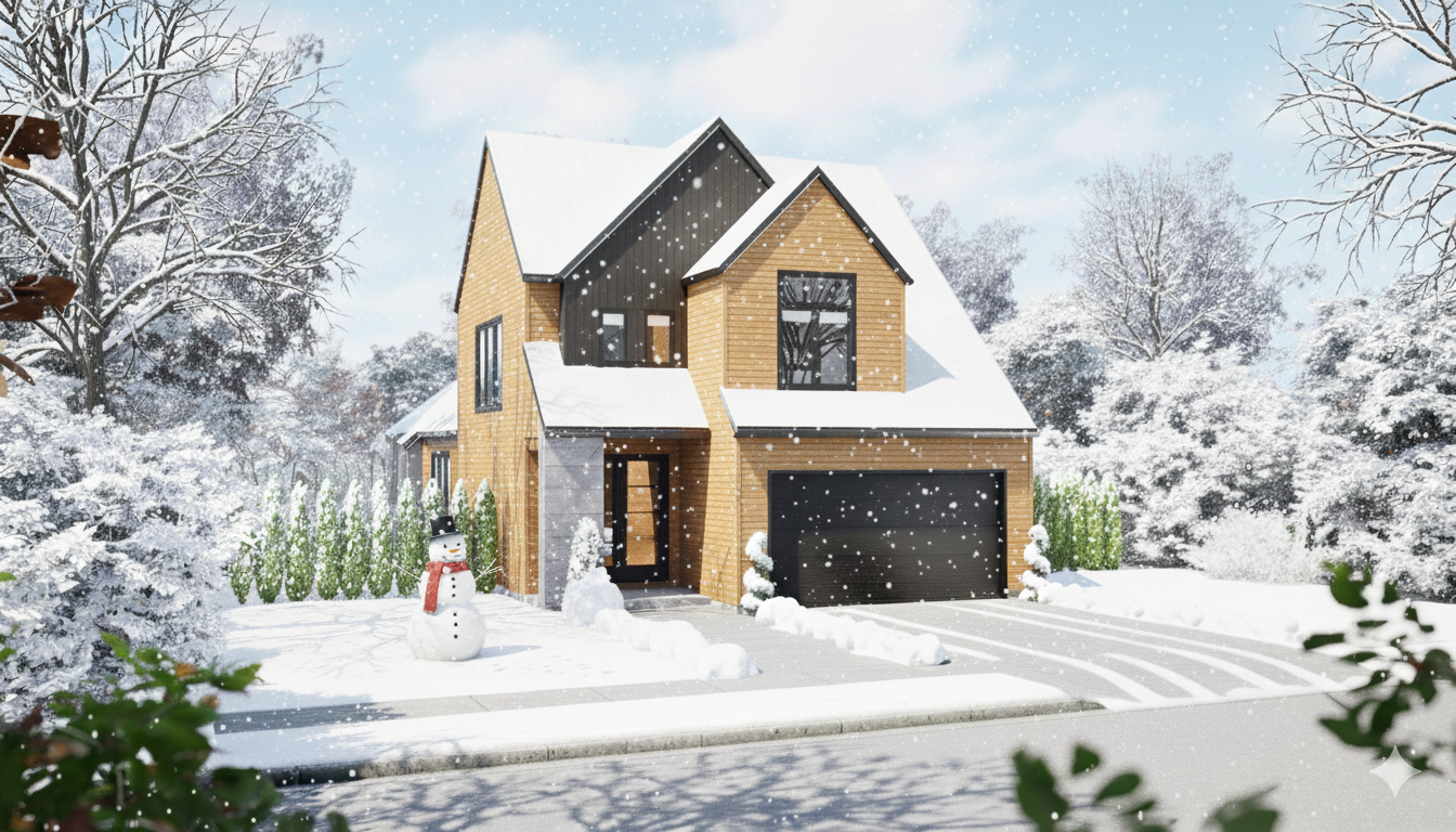 change the weather to a clear winters day it is not snowing important do not change the architecture or landscaping