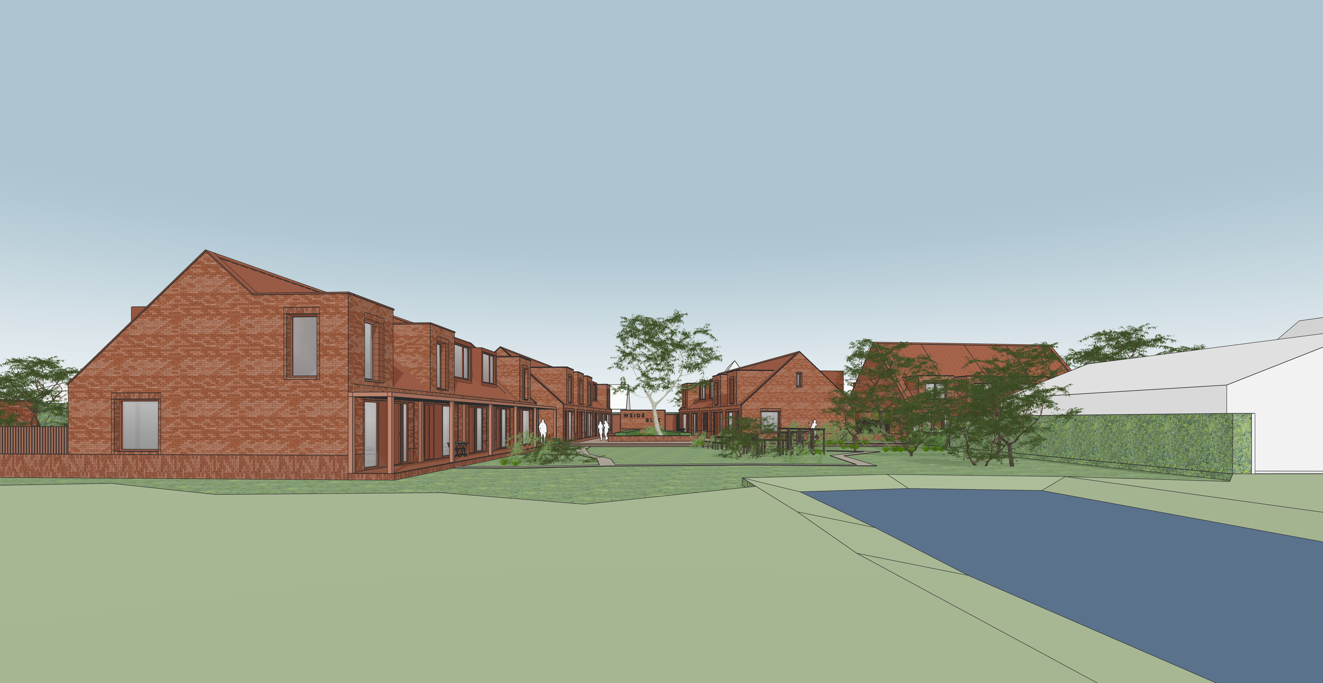atmospheric architectural visualization of a calm and inviting residential courtyard composed of contemporary brick buildings with pitched roofs and simple refined geometries roofs clad in red brown vertical panels with a soft matte slightly weathered appearance fa ades in warm uniform red brown brick wooden window and door frames subtly richer and redder in tone adding warmth and contrast brick dormers gently integrated into the roofscape the setting flows into a lush ecological meadow landscape with tall grasses wildflowers low plants and scattered shrubs forming a natural slightly wild environment the landscape feels soft immersive and expressive like a nature playground where children can wander and play freely a small courtyard tree with warm toned foliage adds a poetic seasonal accent the overall atmosphere is harmonious and intimate expressing a small scale cohesive neighborhood with a strong sense of community and human scale lighting is soft diffused and slightly glowing with a dreamy overcast sky and subtle warm highlights breaking through clouds gentle haze soft shadows and a slightly painterly quality colors are natural but delicately enhanced with a warm red brown palette a few people appear as soft understated figures neighbors interacting children playing in the grass blended naturally into the scene style semi realistic atmospheric slightly painterly architectural render cinematic mood soft focus depth subtle grain poetic composition emphasis on light air and feeling rather than sharp detail parameters maintain color harmony warm red brown tones seed 10