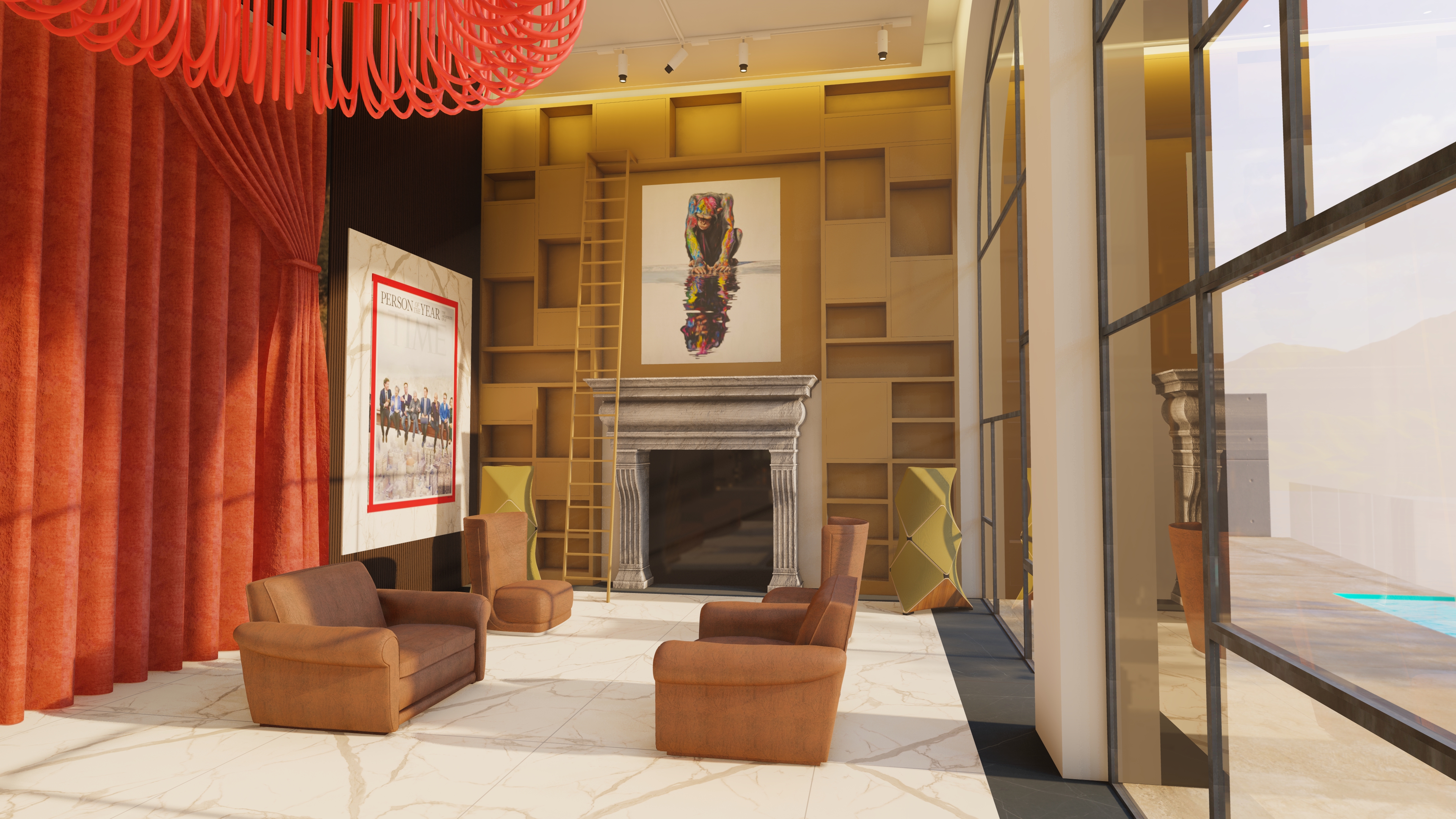 make the view hyperrealistic improve the reflections but do not modify the textures and the paintings enhance the lighting to create a golden hour effect the curtain is made of red velvet 5 meters high improve the velvet effect do not modify or add any curtains make the matte effect of the slats on the wall and above the red curtain more realistic the armchairs are by baxter and made of dark brown leather improve the leather texture add books and littre objects in the library add a girl in blrur motion the room is 6 meters high