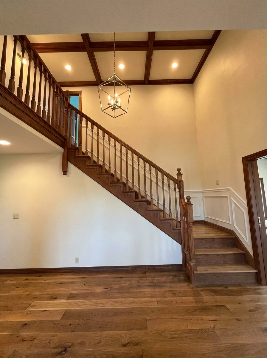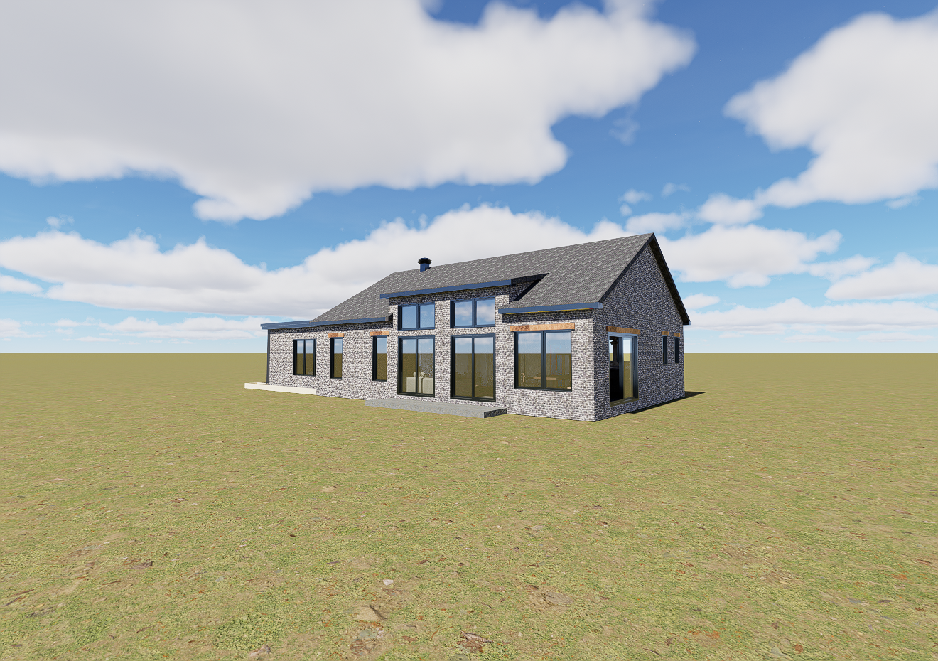 ultra realistic editorial architectural photography of a high end modern farmhouse backyard in quebec warm soft natural late afternoon daylight slightly overcast sky diffused light calm inviting and refined atmosphere understated luxury lifestyle feeling no dramatic lighting no harsh shadows no hdr effect off white board and batten siding with a slightly warm tone beige fascia and soffits dark framed windows charcoal black natural wood lintels above windows slightly weathered not too orange subtle light limewashed brick or stone accents tuscan inspired backyard adapted to a north american residential context minimalist rectangular swimming pool with slightly desaturated natural water color light stone or travertine terrace terracotta pots lavender olive tree accents subtle not dominant organic mediterranean style landscaping mixed with natural north american vegetation realistic uneven ground natural grass variation no empty terrain cozy but minimal high end outdoor furniture very few pieces clean and balanced composition architectural focus credible but slightly idealized realism subtle imperfections natural material variation no overly smooth or plastic surfaces shot with a professional full frame camera 35mm lens eye level perspective soft depth of field sharp but natural focus global illumination physically accurate lighting no artificial look no surreal elements no over stylization no excessive decoration