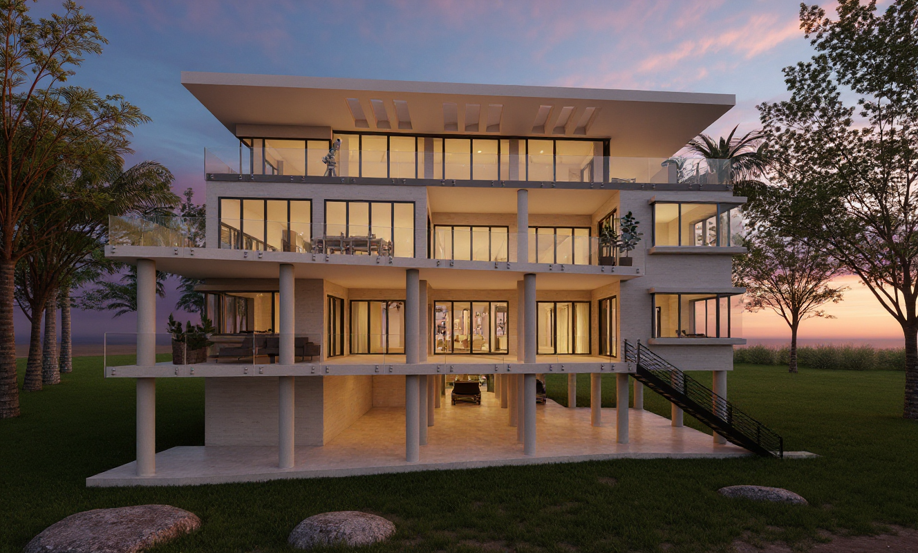 default house details and no change create high resolution image modern four story house sleek white exterior large glass windows with black window frames glass railing every floor surrounding beach trees natural green grass with some big stone colorful sky peaceful atmosphere soft shadows minimalist design clean lines contemporary architecture turn on light inside the house