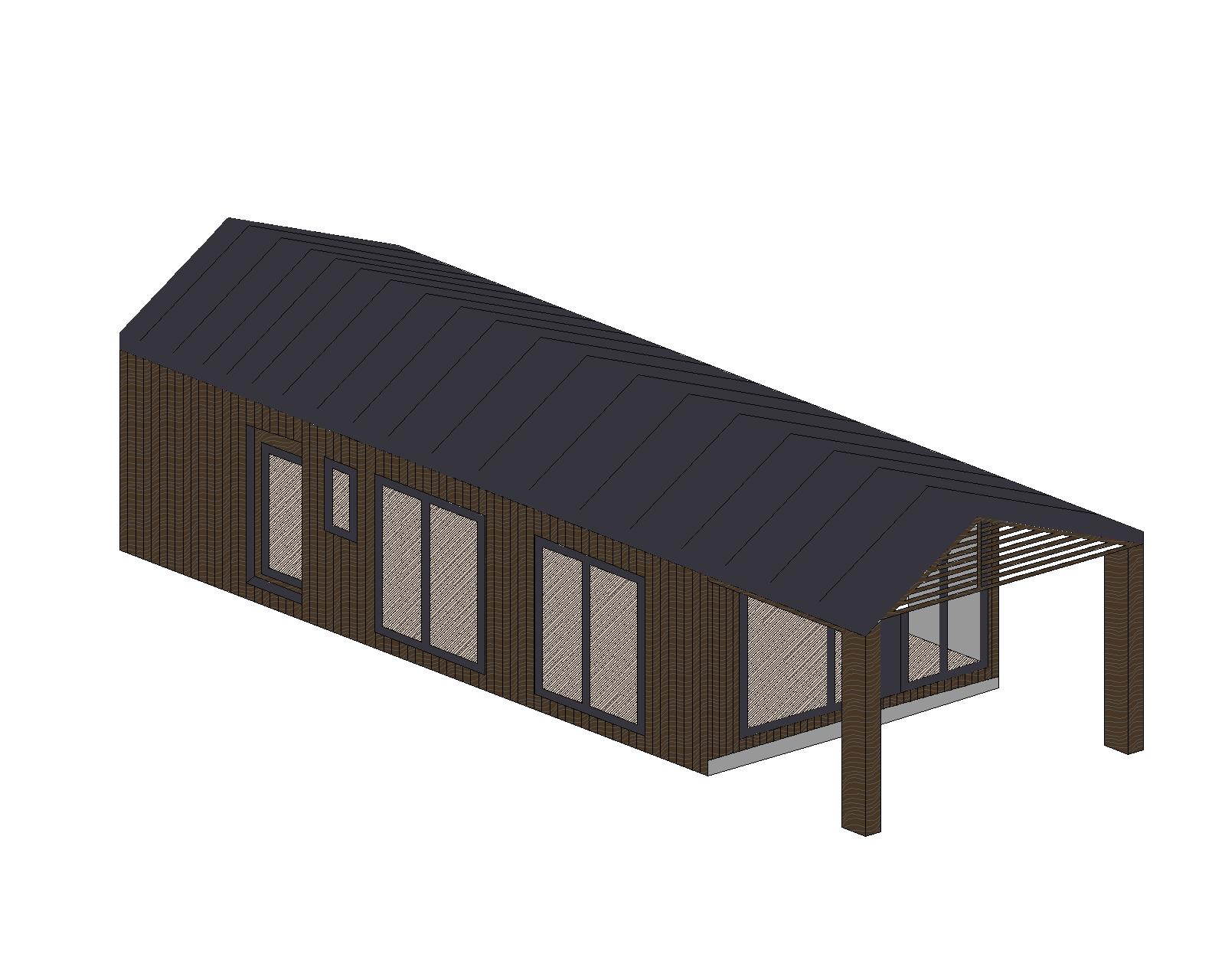 generate a realistic corner perspective 3 4 view of a single family house based strictly on the provided orthographic side elevations preserve the exact massing proportions and roof geometry a low pitch gable roof with dark trim exterior walls finished in red brick with subtle texture on the main facade include large floor to ceiling sliding glass doors with triangular clerestory glazing following the roof slope on the adjacent side facade include smaller vertical rectangular windows matching the positions from the elevations camera at eye level 35 45 mm focal length natural daylight soft shadows neutral plain background semi realistic architectural visualization style clean and minimal scene no environment elements